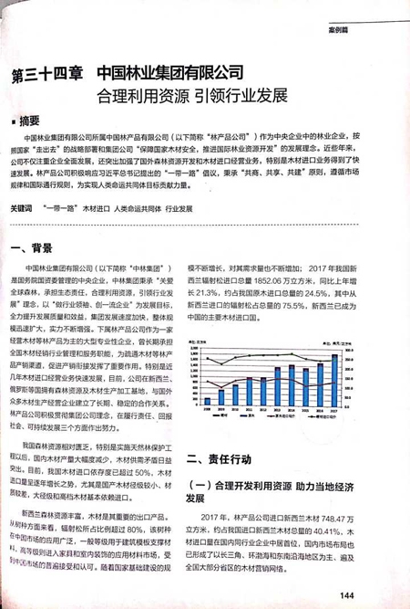 集团公司编写的《合理利用资源 引领行业发展》被收录本年度蓝皮书。编委会充分肯定了集团所属林产品公司积极响应习近平总书记提出的“一带一路”倡议,秉承“共商、共享、共建”原则,遵循市场规律和国际通行规则,依法合规开展国际化经营,不仅促进了当地林业行业健康发展,改善当地民生福祉,更有效提高了中国林业企业木材进口贸易谈判中的话语权,为促进全球森林经营可持续发展做出了重要贡献。