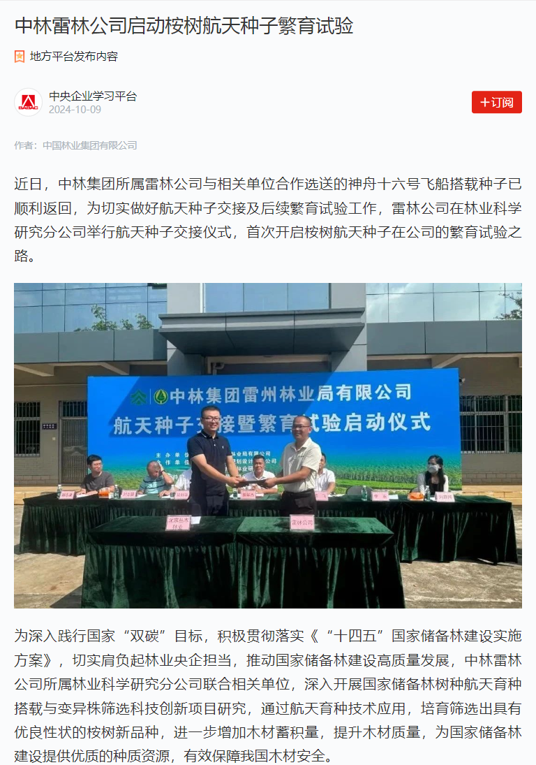 “学习强国”学习平台报道中林雷林公司启动桉树航天种子繁育试验