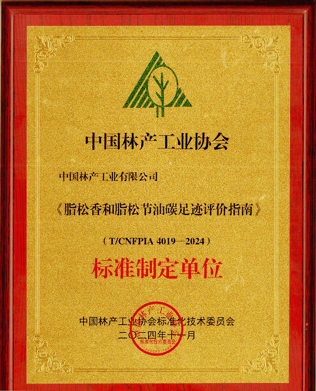 2024年度,中林集团所属中国林产工业有限公司积极落实集团战略部署,始终坚持聚焦主责主业,持续改革创新,助力中林品牌向智能化、绿色化转型升级。作为中国林产工业协会松香分会理事长单位,林产公司牵头组织全国松香行业重点企业和科研院所制订的《松脂碳储量计算方法》和《脂松香和脂松节油碳足迹评价指南》两项团体标准于2024年11月正式发布。