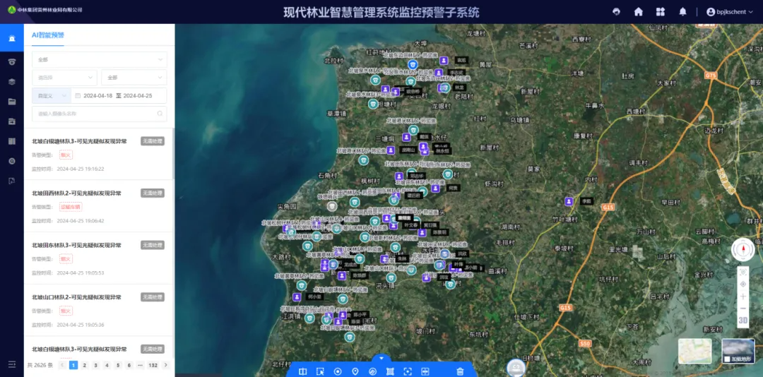 “监控室,我现在所在位置是100300小班,该区域一切正常!”在中林集团所属雷林公司北坡林场分公司监控室,值班员正通过现代林业智慧管理系统监控预警子系统与护林员实时通话并查看该小班的防火动态。