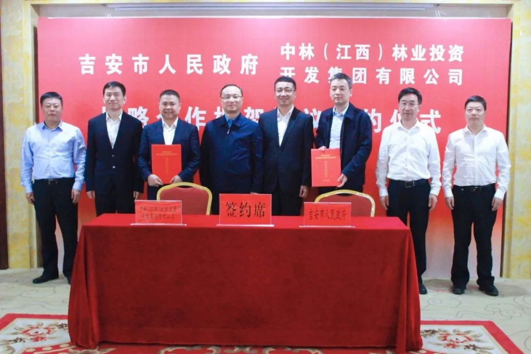 10月11日,中林集团所属中林赣投集团与吉安市人民政府签约战略合作框架协议。根据协议,双方将合作共建国家储备林200万亩、高产油茶100万亩,并在国土绿化、林下经济、林业碳汇、林业科研与技术推广等重点