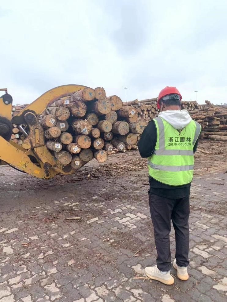 国庆假期,中林浙江国林公司正在港口装卸木料。