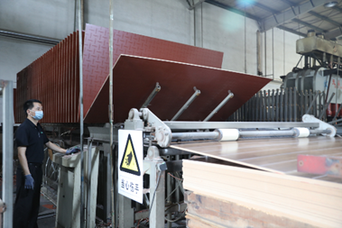 中林永安林业蓝豹家居车间,操作工正在进行热压凉板冷却出板码垛操作。