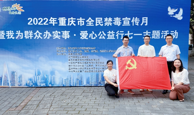 为庆祝中国共产党成立101周年,进一步发挥党建引领作用,持续深入开展“我为群众办实事”实践活动,重庆林投公司本部党支部联合星汇社区开展“2022年重庆市全面禁毒宣传月暨我为群众办实事·爱心公益行”七一主题实践志愿者服务活动。