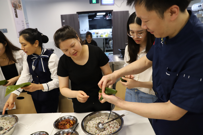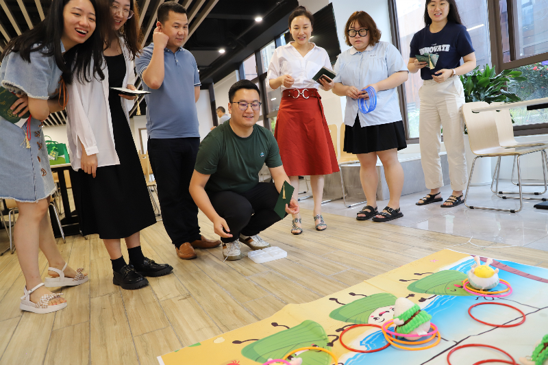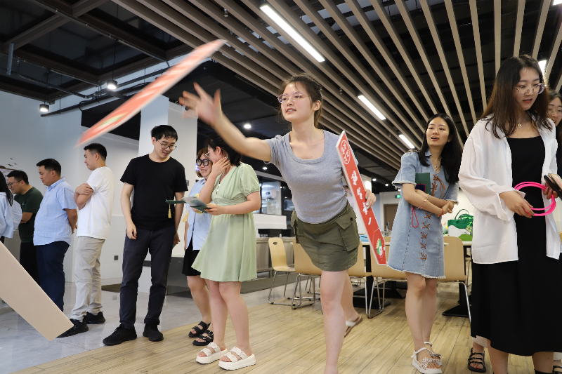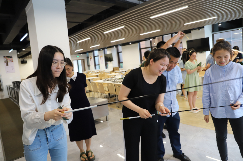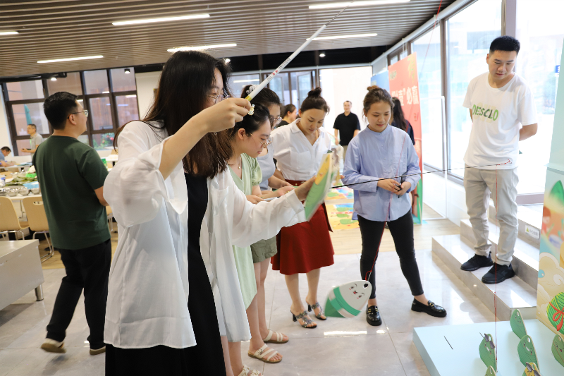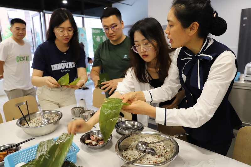 随后,全体党员、团员青年及群众代表来到公司五楼,参加端午节游戏及包粽子等系列游园活动。在“欢乐‘套’粽子”、“投‘壶’必赢”、“‘毒’散吉来”等四个游戏环节中,大家集中精神、手脑并用,积极地投掷着圆圈、用力地靠近壶桶、专注地勾钓着道具……时不时地发出一阵胜利的欢呼,身边的同事也积极为他们加油鼓劲,整个活动现场热闹非凡。游园活动后,大家围坐在一起包粽子,体验端午节的传统习俗。很多同事虽然是第一次动手,但经过学习观摩后逐渐包出了漂亮的“成品”。在欢声笑语中,大家交流着包粽子的方法技巧,感受着传统文化的魅力,加深了相互之间的沟通交流。一个小游戏,一个小粽子,一个充满传统文化氛围的主题党日,因为党员们的诠释,有了别样的温度。