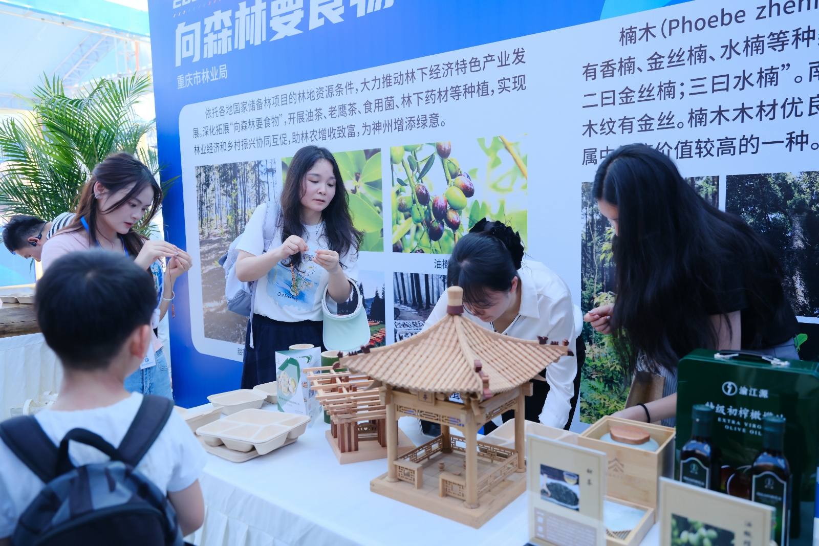 “向森林要食物”展览板块,主要展出了重庆林投公司依托各地国家储备林项目的林地资源条件,大力推动林下经济特色产业发展成效。近年来,重庆国储林项目深化拓展“向森林要食物”,开展油茶、老鹰茶、食用菌、林下药材等种植,实现林业经济和乡村振兴协同互促,助林农增收致富,为神州增添绿意。