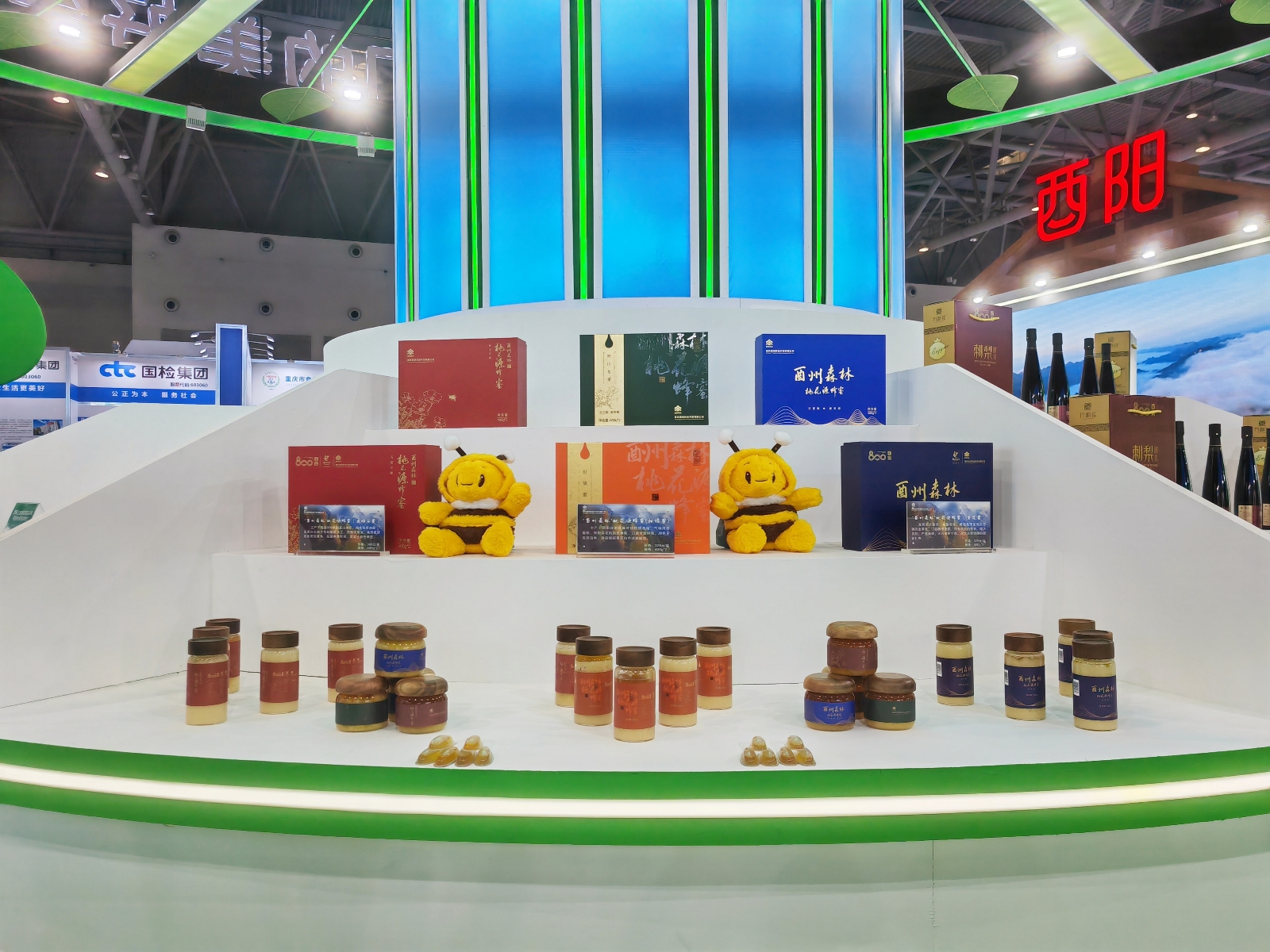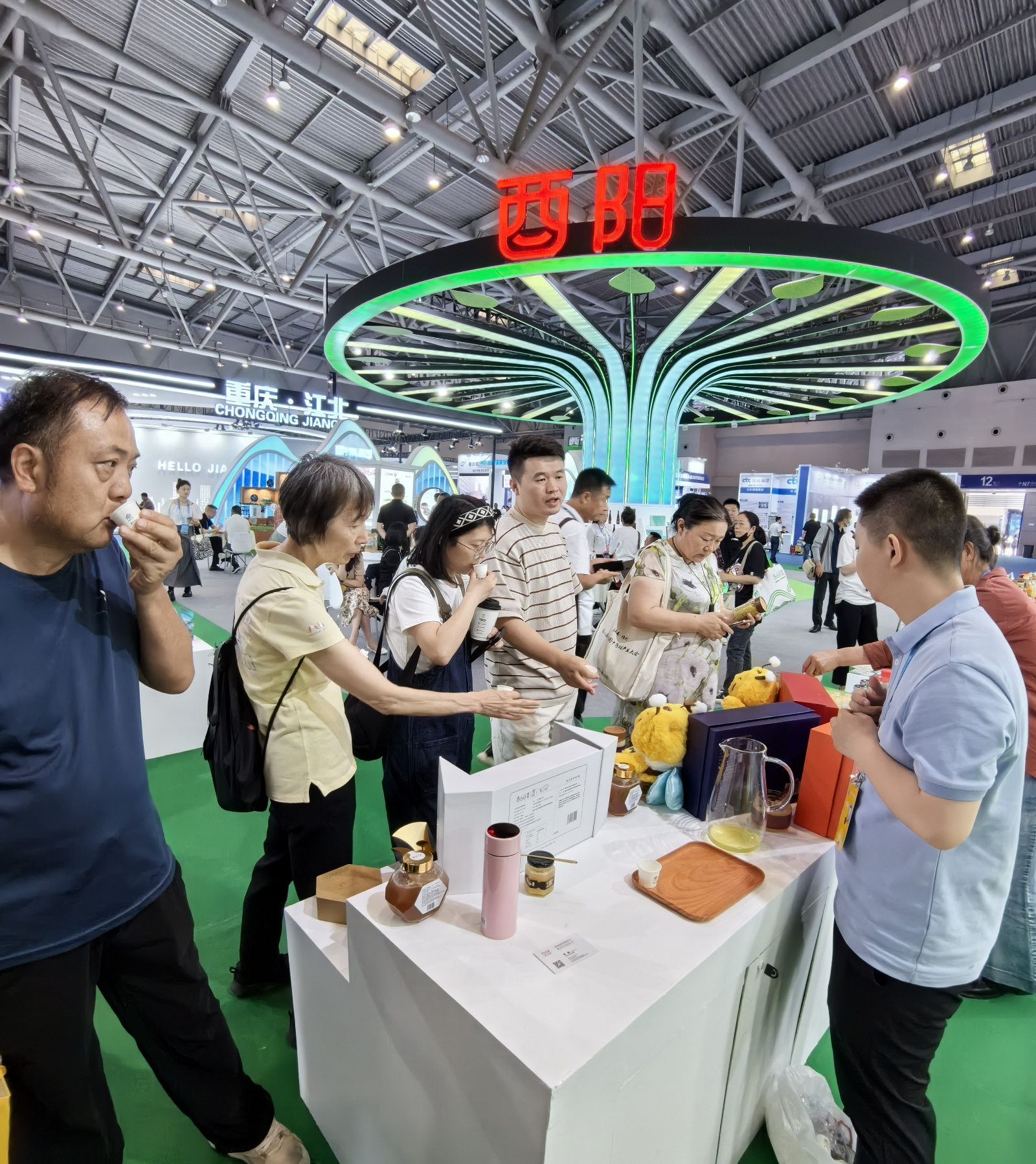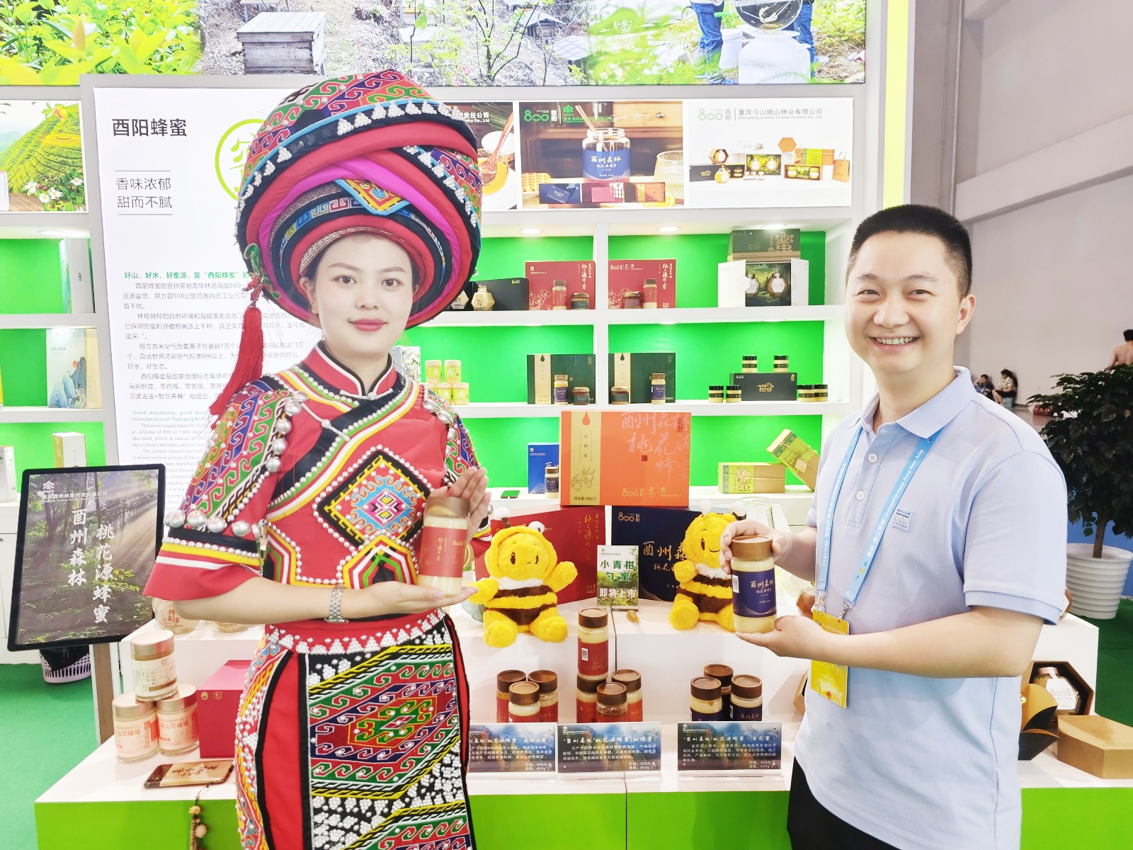 “酉州森林”纯天然蜂蜜展台前人头攒动,大家争先品尝和分享纯天然蜂蜜的甜美。酉州林开公司利用国储林林地资源带动当地发展蜜蜂养殖,开发出的6款“酉州森林”纯天然蜂蜜产品均已获得国家知识产权标识。