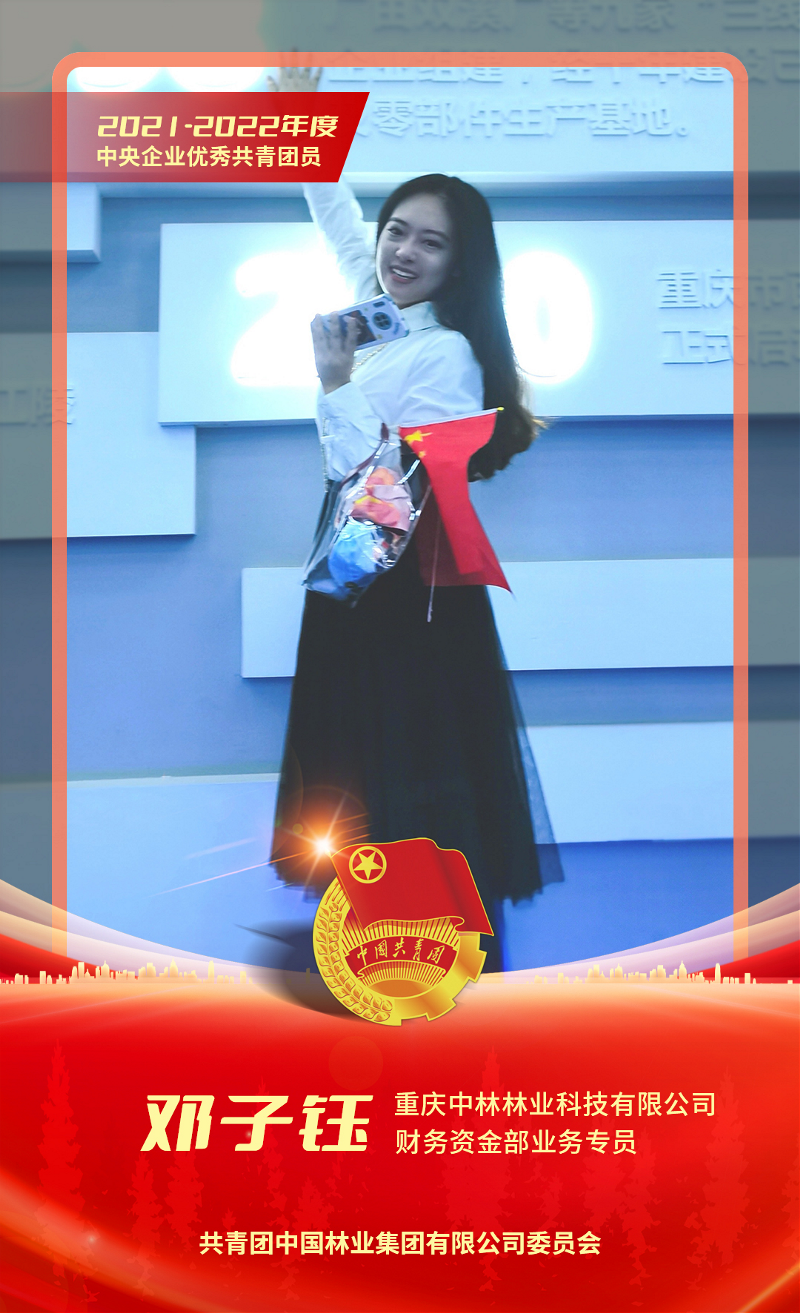 邓子钰同志现任重庆中林林业科技有限公司财务资金部业务专员。她主动担当作为,梳理公司账务,配合推进财务管理前置化,为加强公司风险管控作出了重要贡献。为规范公司内部报销管理流程,邓子钰利用个人时间将相关制度流程进行梳理,并制作培训课件。她主动向党组织靠拢,积极参加公司党组织的各项活动,获庆祝建党100周年“学党史、颂党恩、跟党走”主题演讲比赛中二等奖、“党史知识分享”征图比赛一等奖。此外,邓子钰还积极参与捐书活动和防疫志愿活动,用实际行动践行“永远跟党走”。 奋进新青年,筑梦新征程。希望公司广大干部职工更加紧密地团结在以习近平同志为核心的党中央周围,深入学习贯彻习近平新时代中国特色社会主义思想,向优秀学习、向先进看齐,用青春浇灌绿水青山、用汗水孕育金山银山,为全力打造全国储备林建设样板而团结奋斗! 相关信息