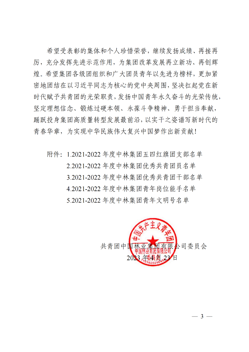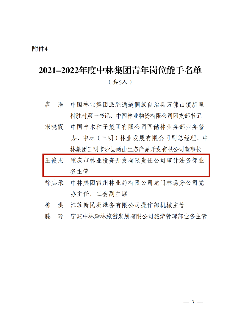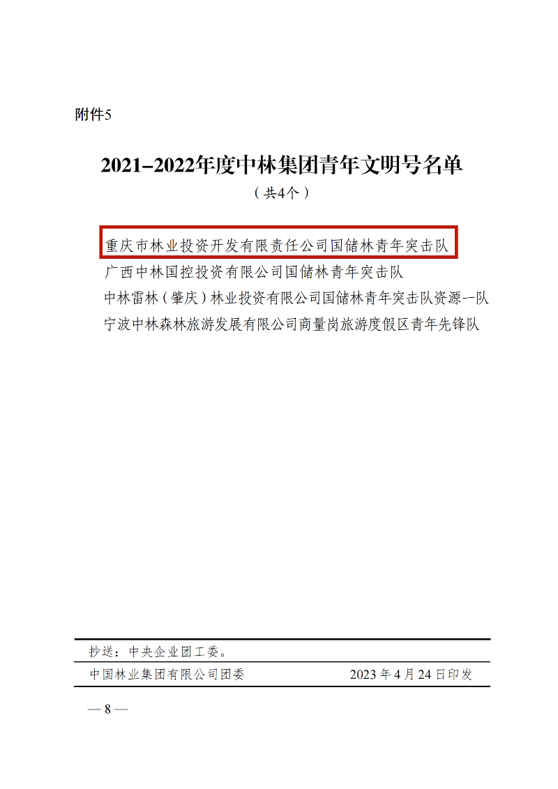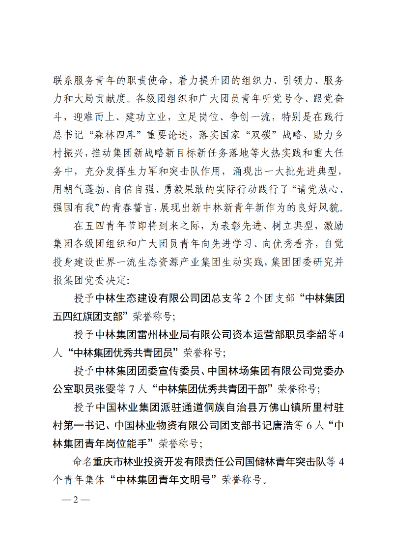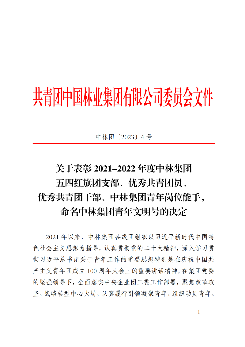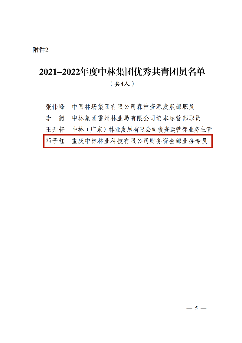 在五四青年节即将到来之际,中林集团决定表彰2021-2022年度中林集团五四红旗团支部、优秀共青团员、优秀共青团干部、中林集团青年岗位能手,命名中林集团青年文明号。其中,重庆林投公司国储林青年突击队荣登“中林集团青年文明号”名单。同时,公司员工邓子钰、王俊杰分别获2021-2022年度“中林集团优秀共青团员”、“中林集团青年岗位能手”称号。