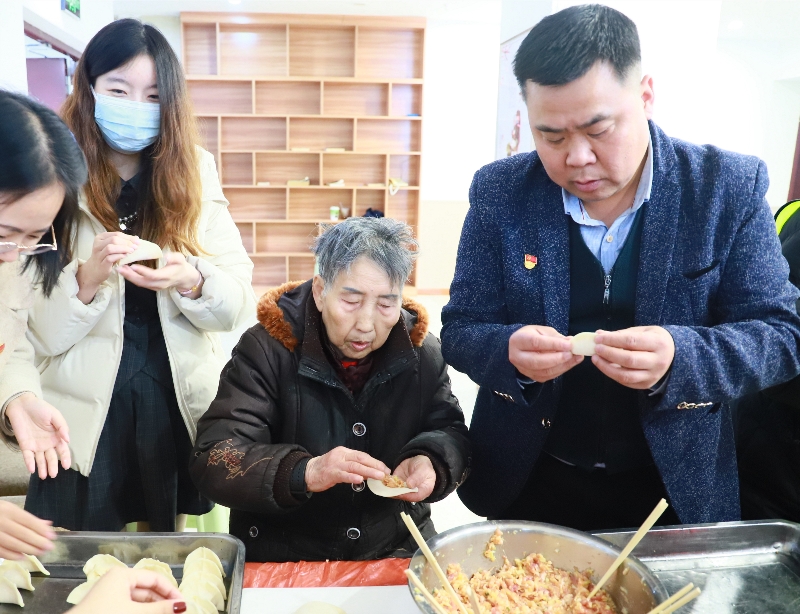 另一组志愿者,已经忙碌着准备包饺子了。只见他们洗菜、切菜、调馅、擀皮、包饺子,由桌子临时拼凑成的厨台上,大家便纷纷“抢占”自己的一席之地,个个动作娴熟,有说有笑,相互交流着包饺子技巧。不一会儿,一盘盘白白胖胖的饺子在大家巧手下托盘而出,大家齐聚一堂,包饺子、唠家常,场面热闹非凡。