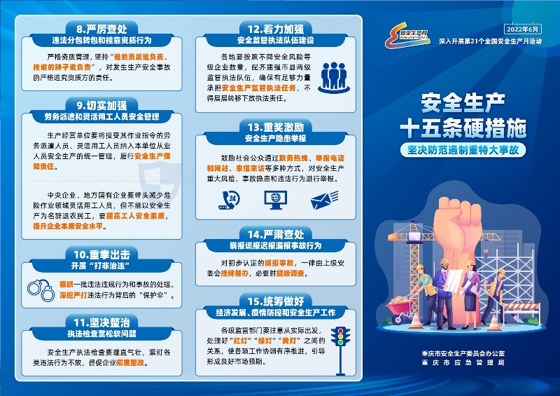 2022年6月是第21个全国“安全生产月”。重庆林投公司及所属各级次企业紧紧围绕“遵守安全生产法 当好第一责任人”主题,深入贯彻集团公司关于安全生产的重要指示,落实集团公司安全生产部署要求,切实抓好安全生产工作,按照“三严三实”的要求,组织开展形式多样的“安全生产月”系列活动,取得了良好效果。 安全生产十五条硬措施