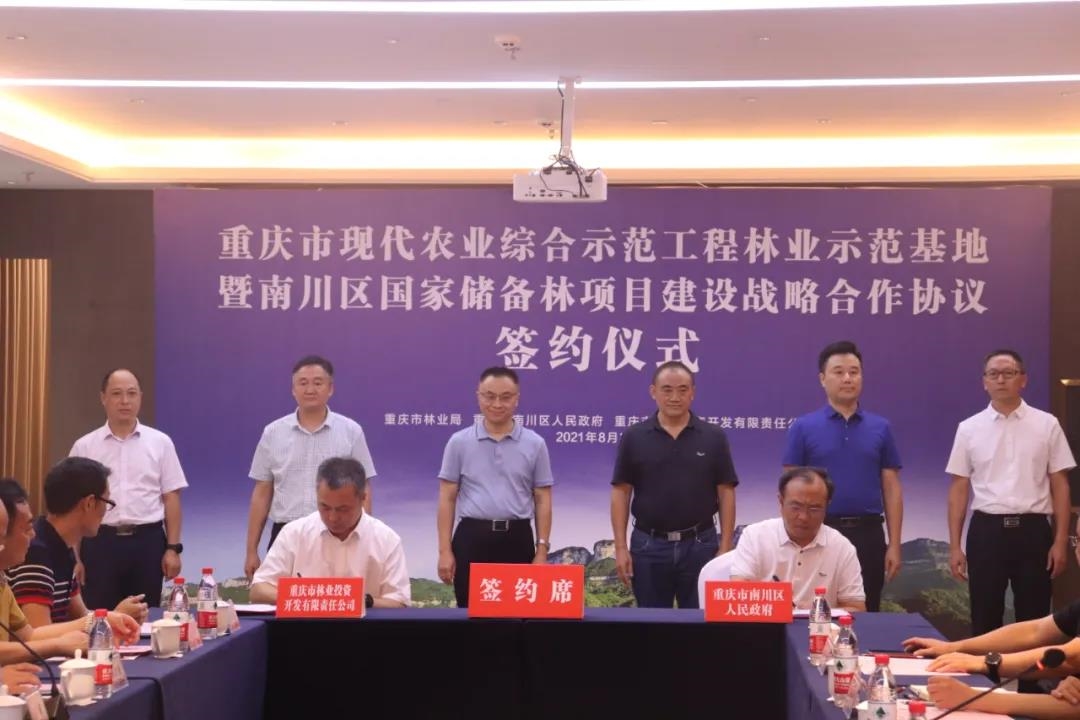 8月25日,重庆市林业局、南川区人民政府、重庆市林业开发有限责任公司共同推进重庆市现代农业综合示范工程林业示范基地暨南川区国家储备林项目建设战略合作协议签约仪式在重庆市南川区隆重举行。南川区区委常委朱高云主持会议,市林业局党组成员、副局长王声斌,党组成员、副局长王定富,二级巡视员陈明礼,公司党总支书记员、副总经理罗廉,党总支委员、副总经理、董事向国伟,党总支委员、副总经理陈学知,区人大党委副主任郑泽辉,区政府副区长罗弟杰,区政协副主席杜帆等出席签约仪式。