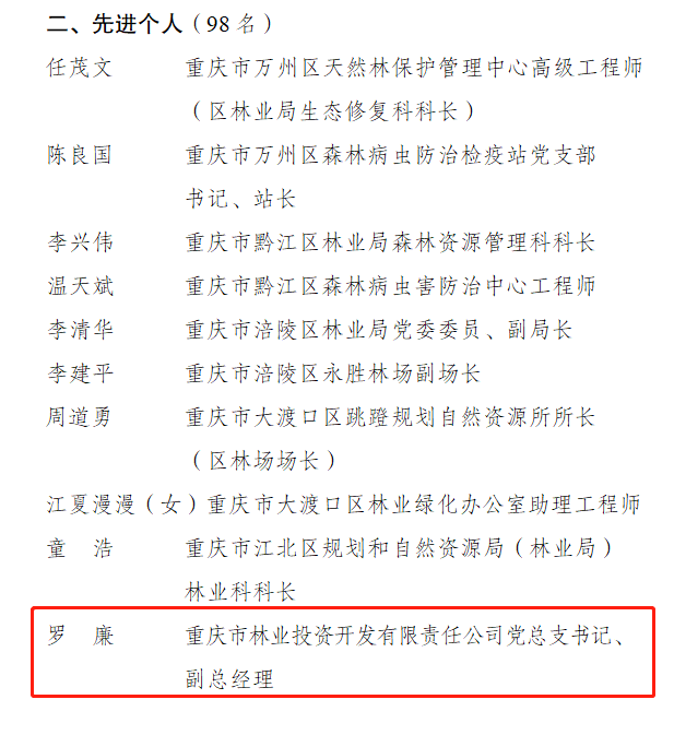 5月27日,重庆市人力资源和社会保障局和重庆市林业局联合发布了关于表彰重庆市林业系统先进集体和先进个人的决定。重庆市林业投资开发有限责任公司荣获先进集体荣誉称号,公司党总支书记、副总经理罗廉荣获先进个人荣誉称号。