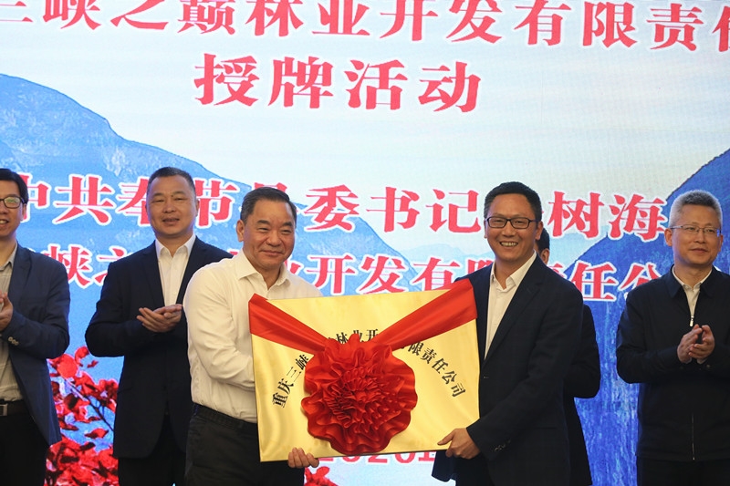 (奉节县县委书记杨树海为三峡之巅公司授牌) 活动中,杨树海为重庆三峡之巅林业开发有限责任公司授牌,重庆三峡之巅林业开发有限责任公司董事长陈学知接牌。