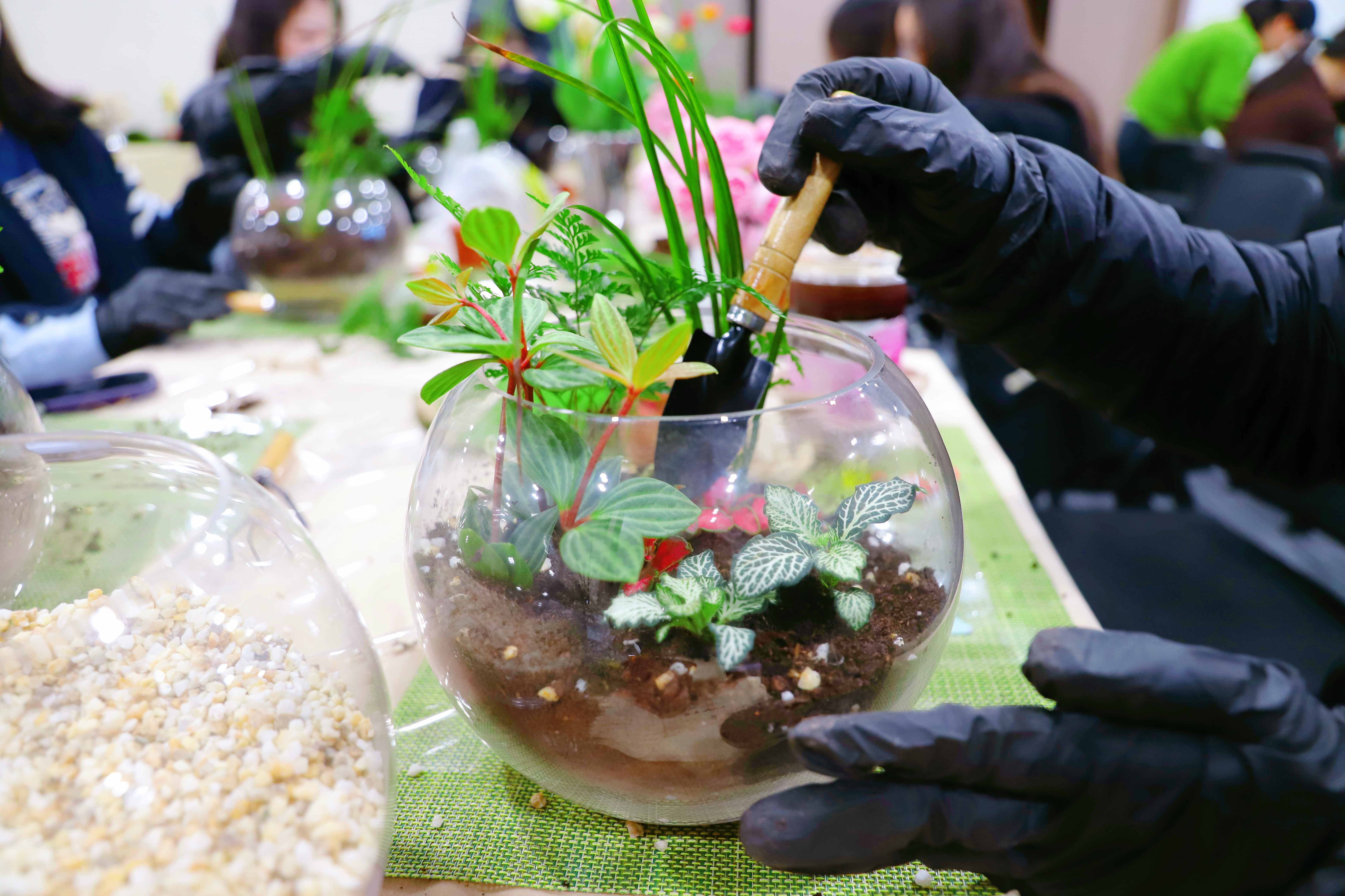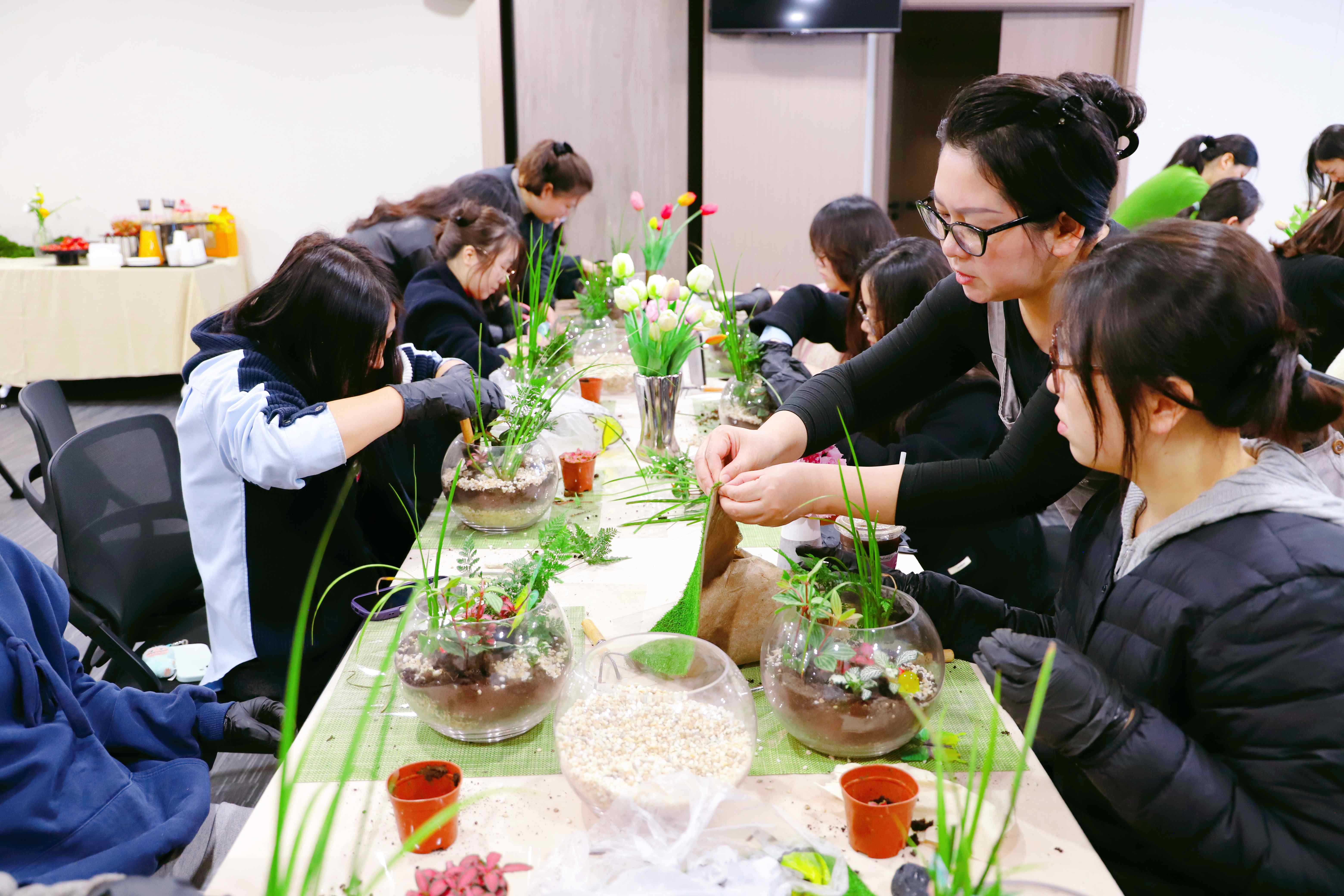 在手作环节,女职工们化身为“巧手园丁”,在花艺师的指导下,认真铺设营养土、栽种植物、覆盖苔藓、点缀装饰小品,将手中的玻璃容器变成一个个妙趣横生的迷你森林。大家专注创作,相互交流灵感,现场欢声笑语不断。经过一个小时的精心打造,一件件独具匠心的微景观作品相继呈现。