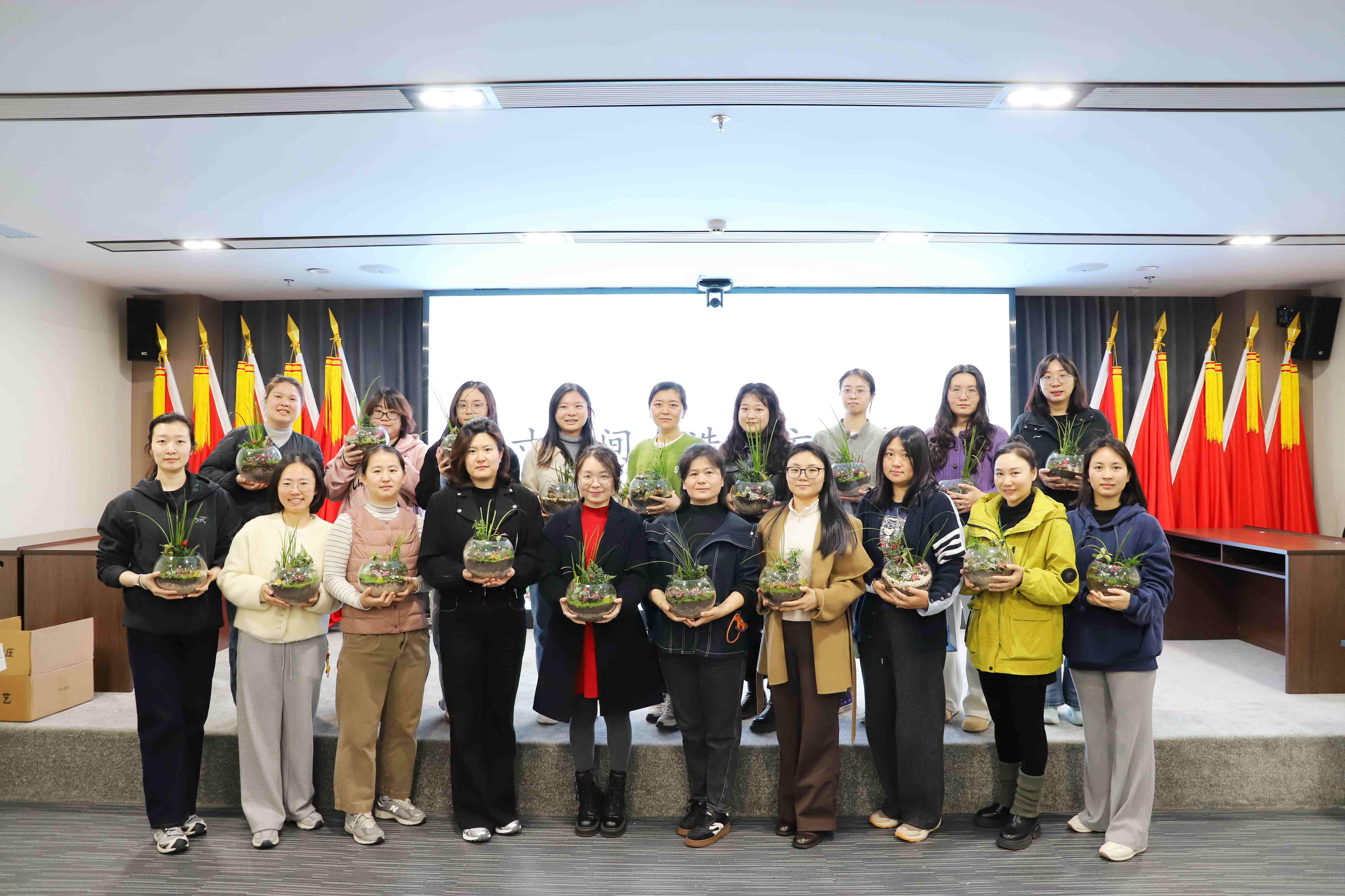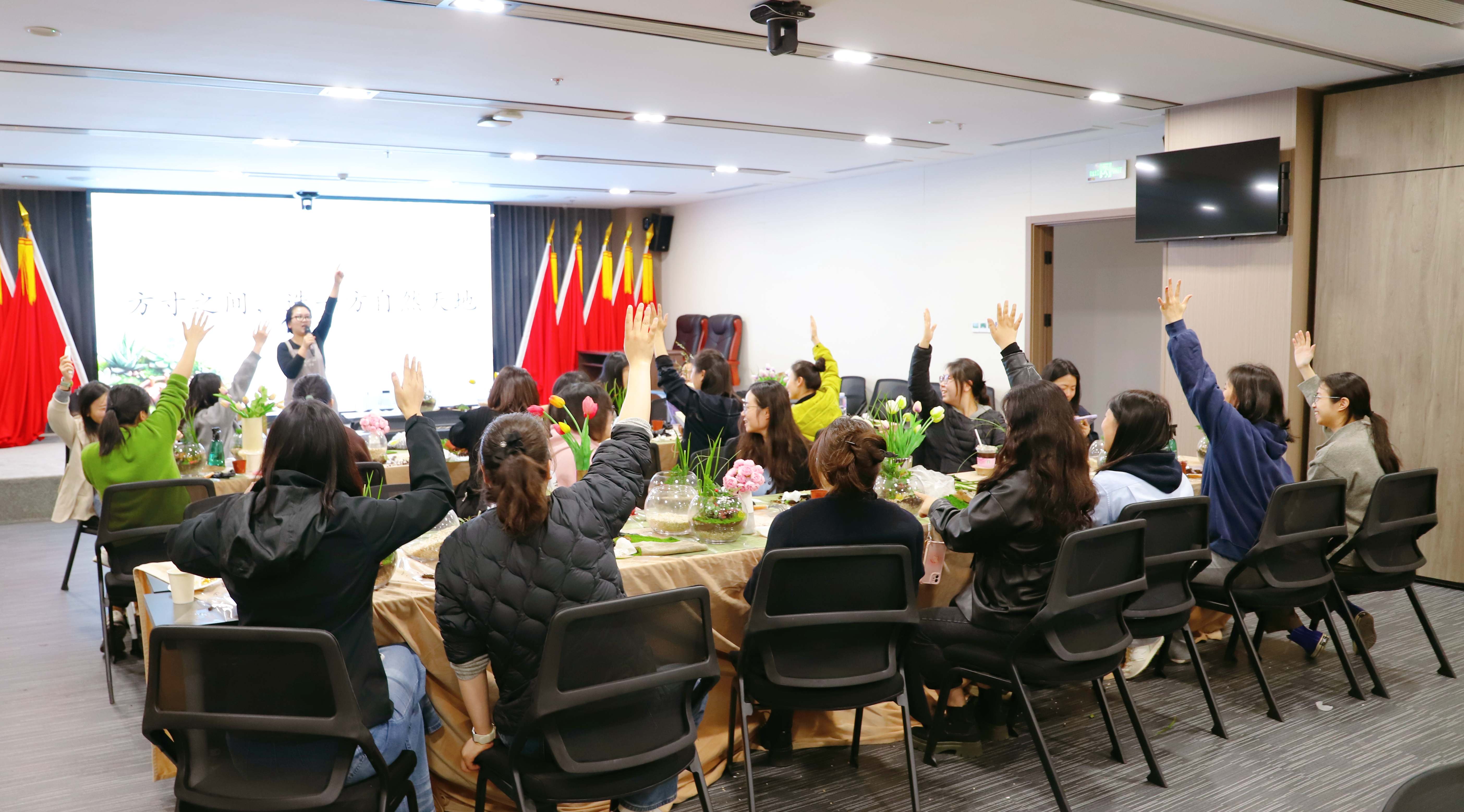 在作品分享环节,女职工们纷纷展示创作成果,交流制作心得。花艺师现场评选并颁发了“最佳创意奖”与“最佳治愈奖”等多个趣味奖项。活动最后,全体人员合影留念,定格这份亲手创造的绿意与美好。