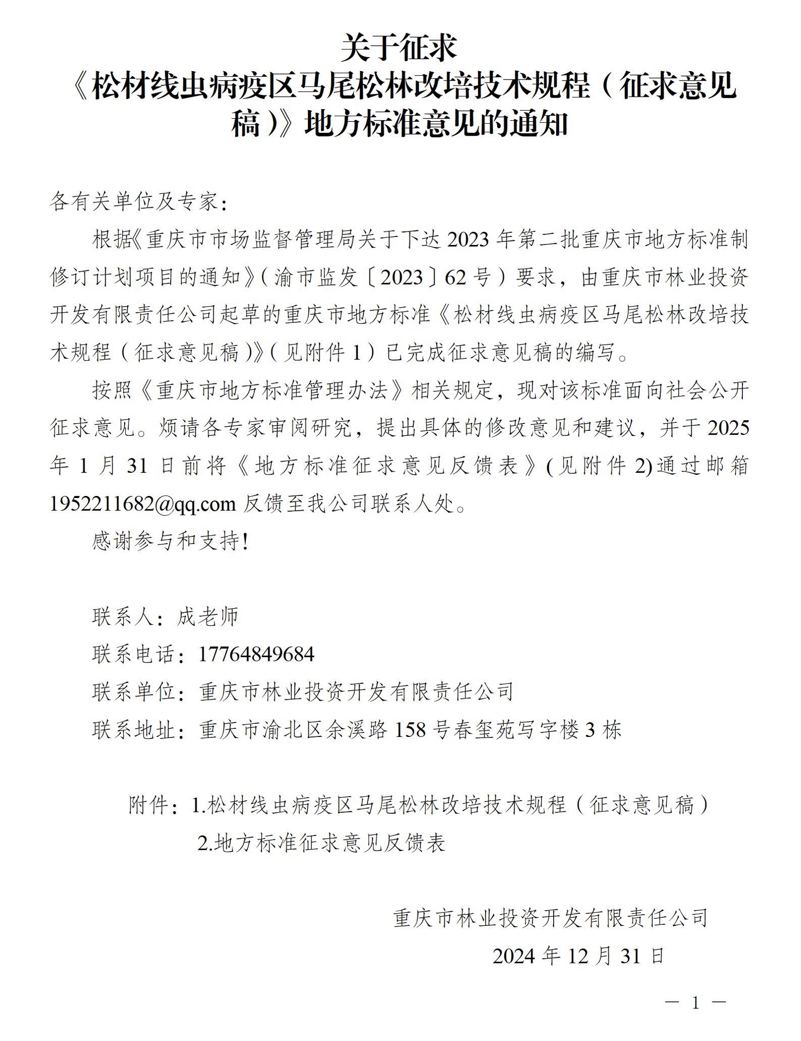 关于征求 《松材线虫病疫区马尾松林改培技术规程(征求意见稿)》地方标准意见的通知