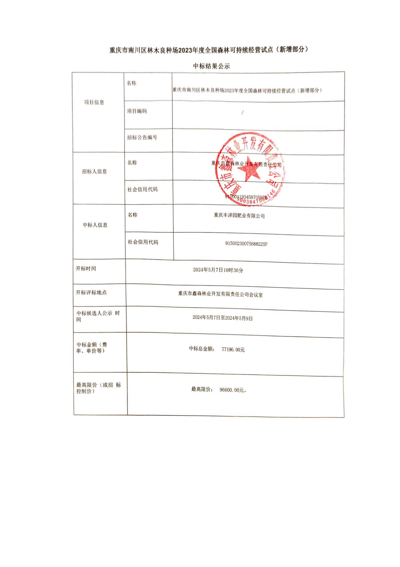 中标结果公告重庆市南川区林木良种场2023年度全国森林可持续经营试点(新增部分)项目