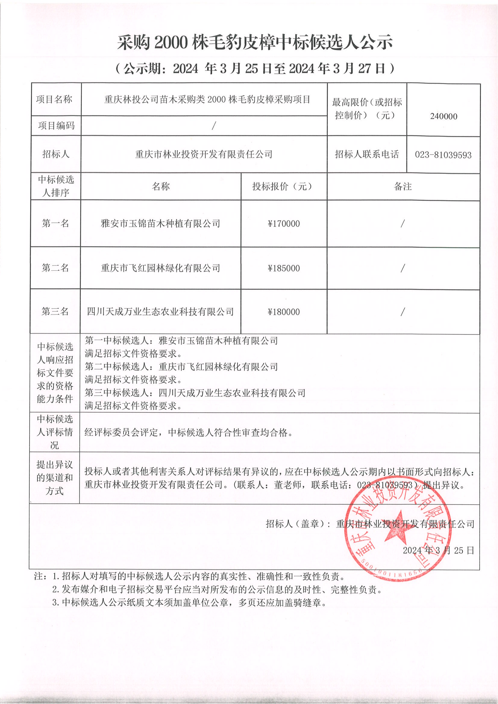 采购2000株毛豹皮樟中标候选人公示