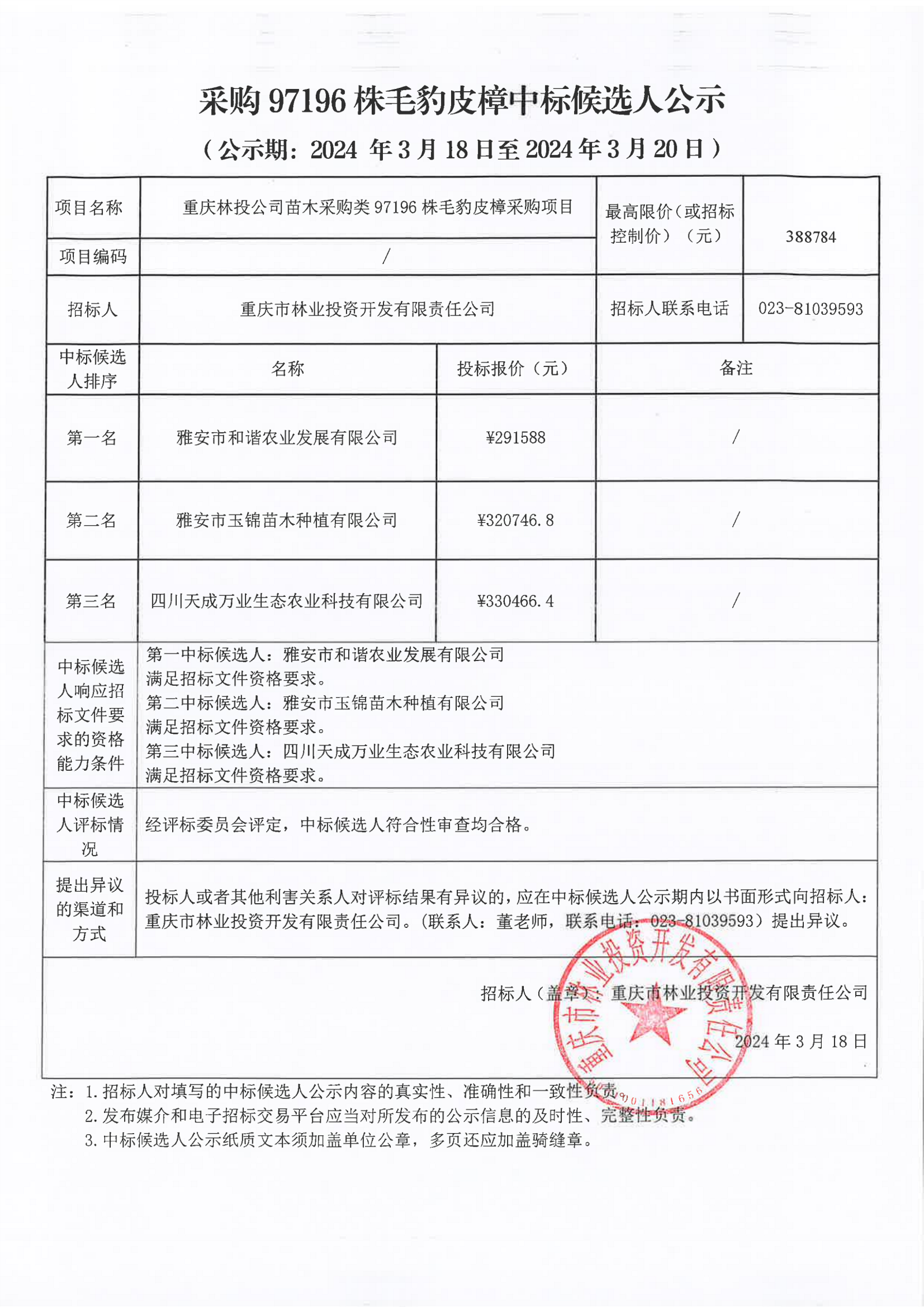 97196株毛豹皮樟中标候选人公示