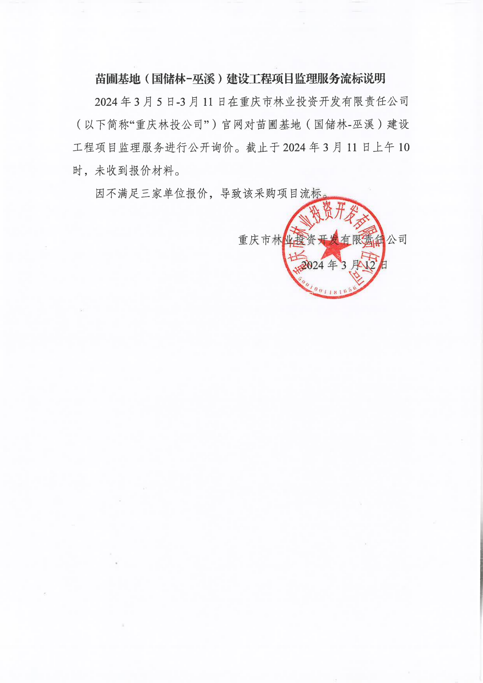 苗圃基地(国储林-巫溪)建设工程项目监理服务流标说明