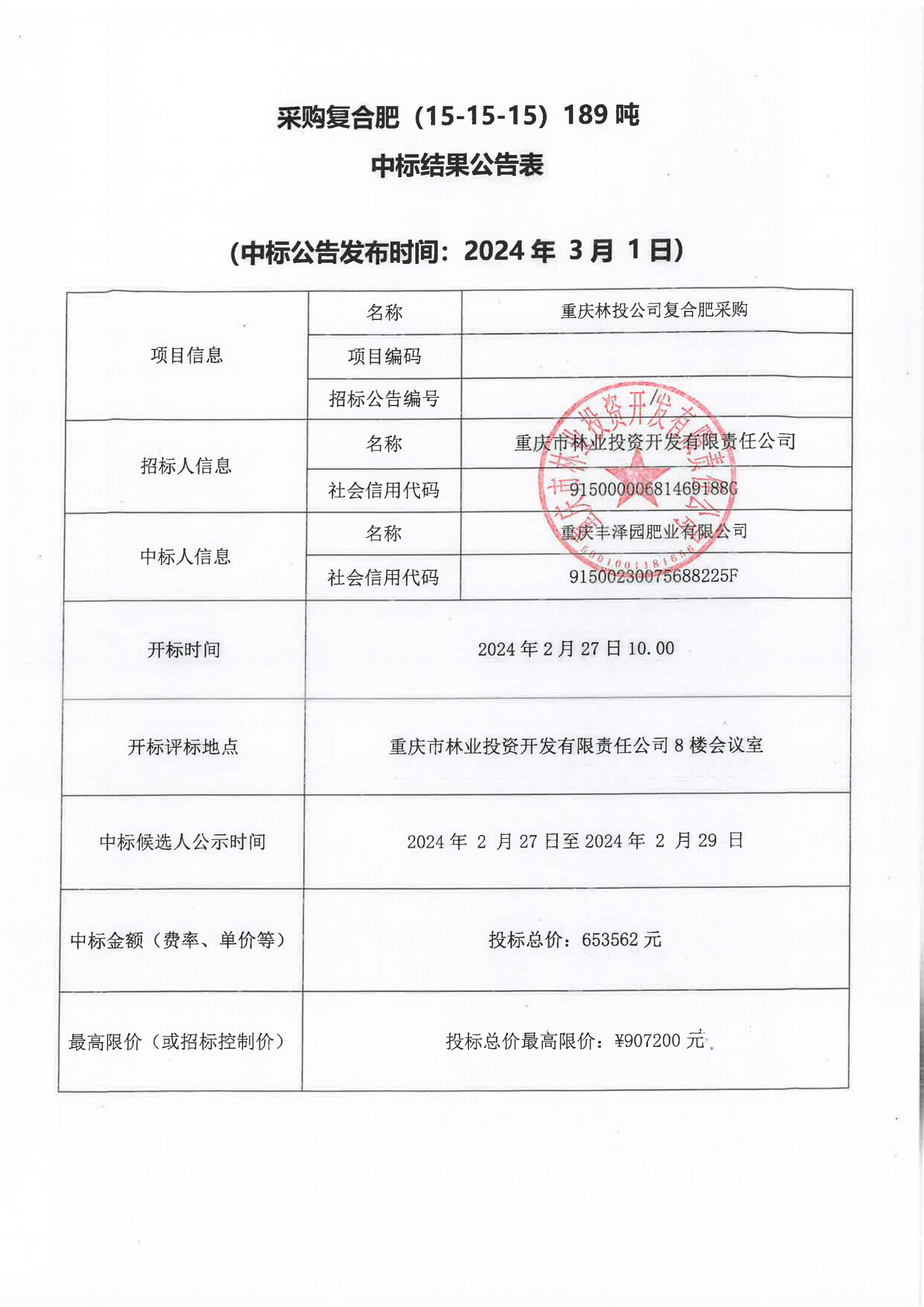 中标结果公告重庆林投公司复合肥采购