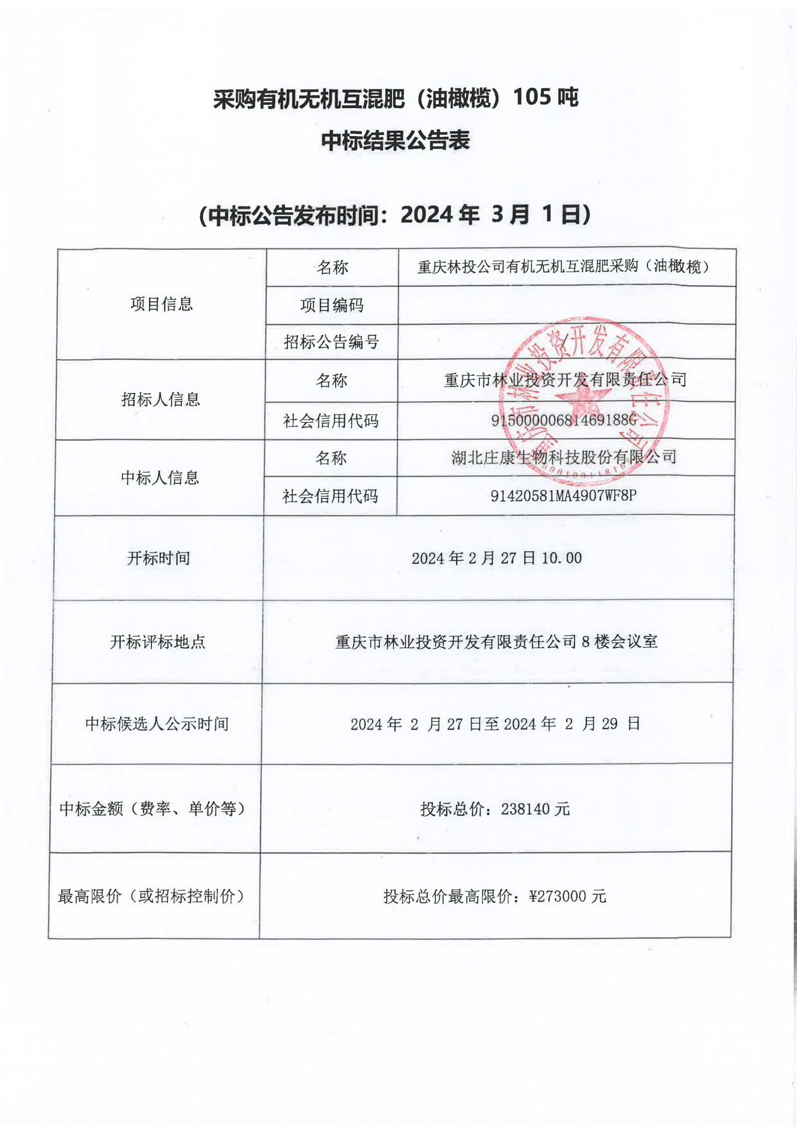 中标结果公告(油橄榄)重庆林投公司有机无机互混肥采购