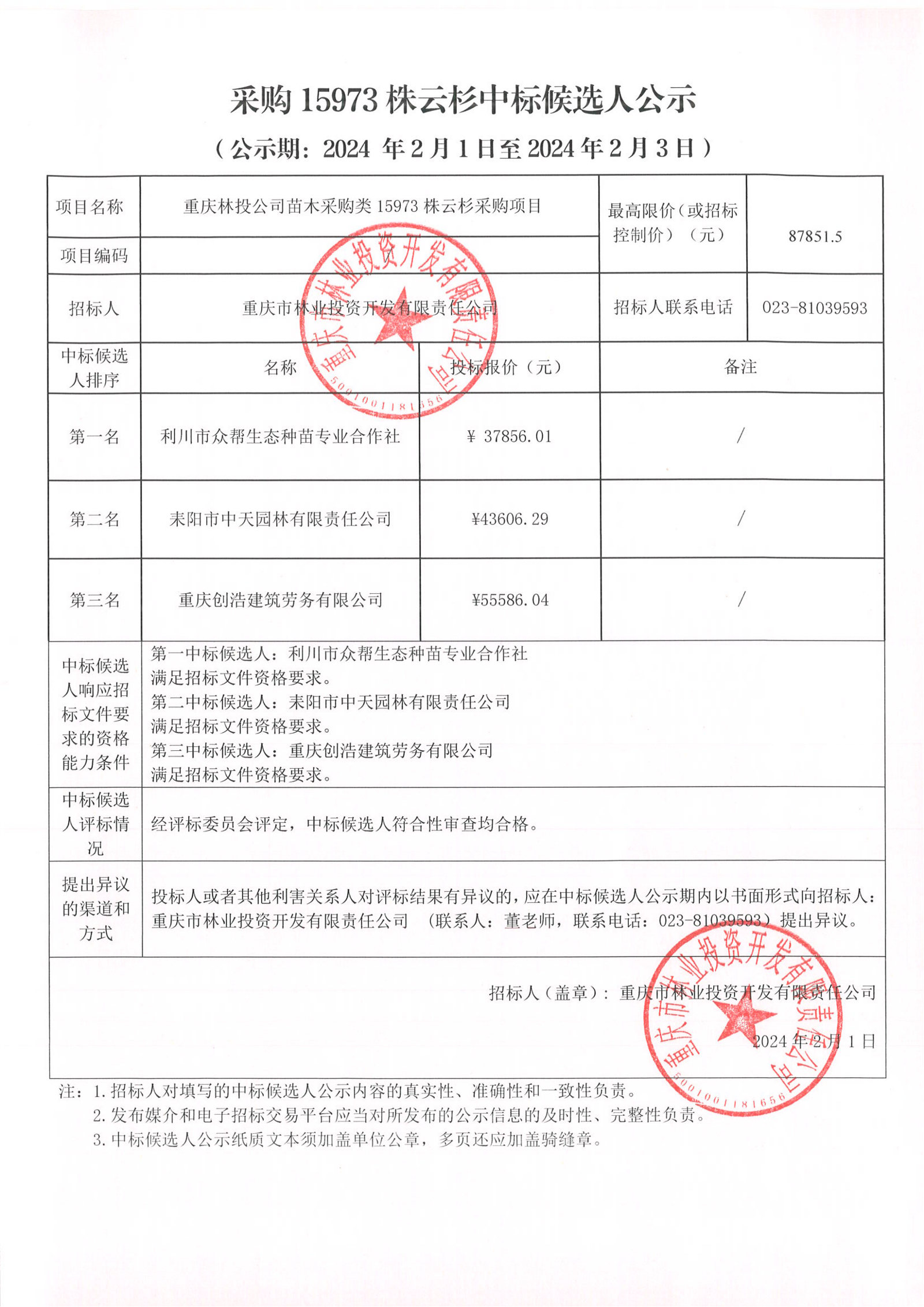 中标结果公告苗木采购类15973 株云杉采购