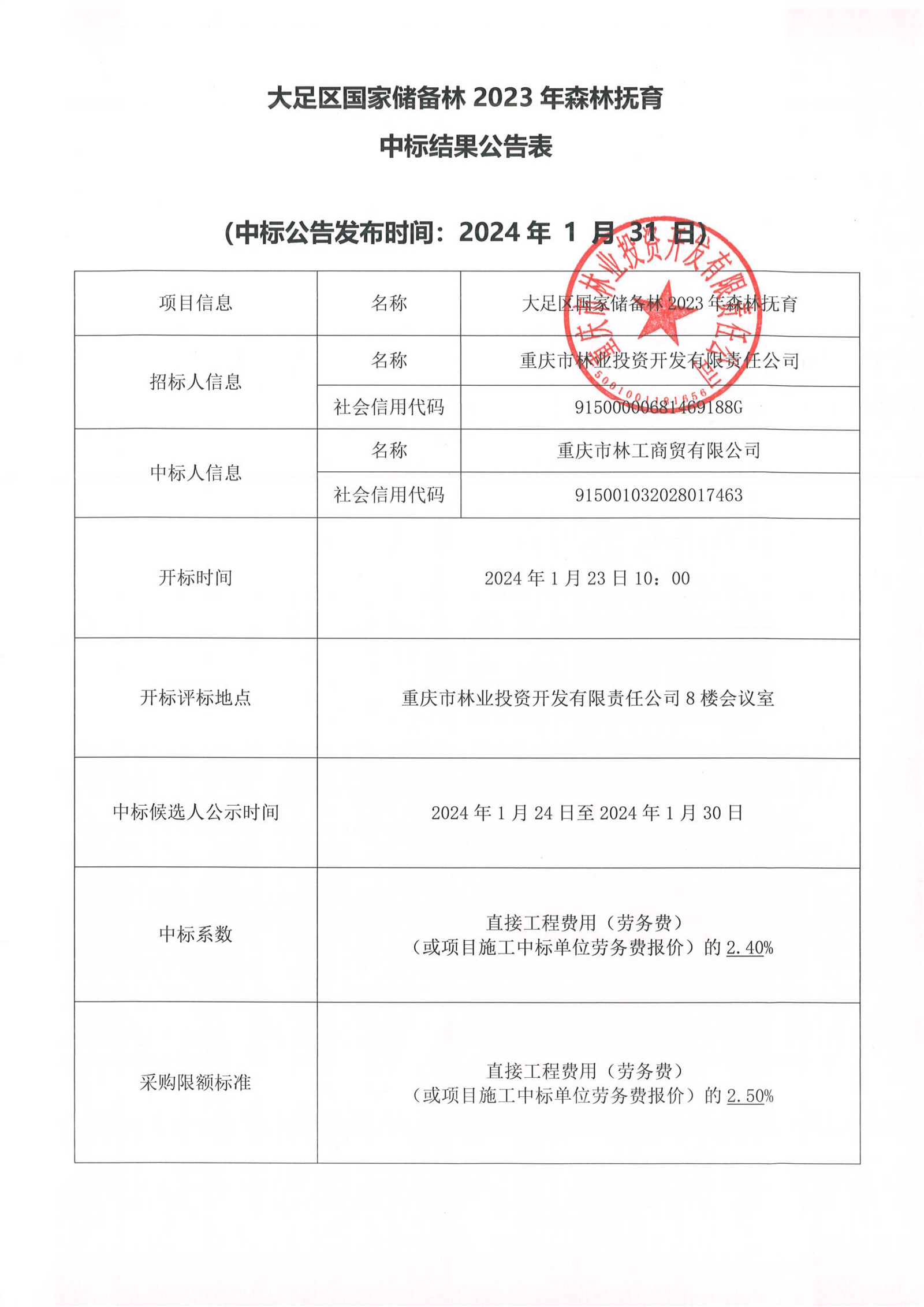 中标结果公告表(大足区国家储备林2023年森林抚育)