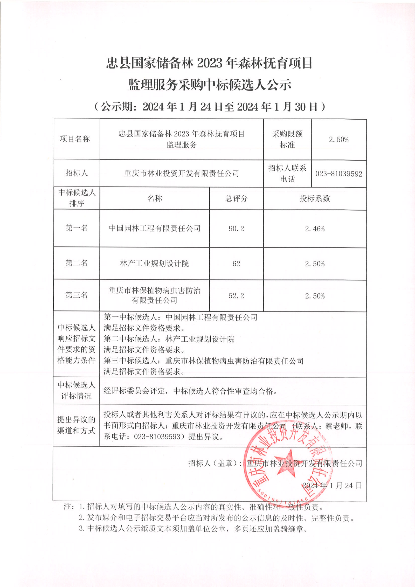 忠县国家储备林2023年森林抚育项目监理服务采购中标候选人公示
