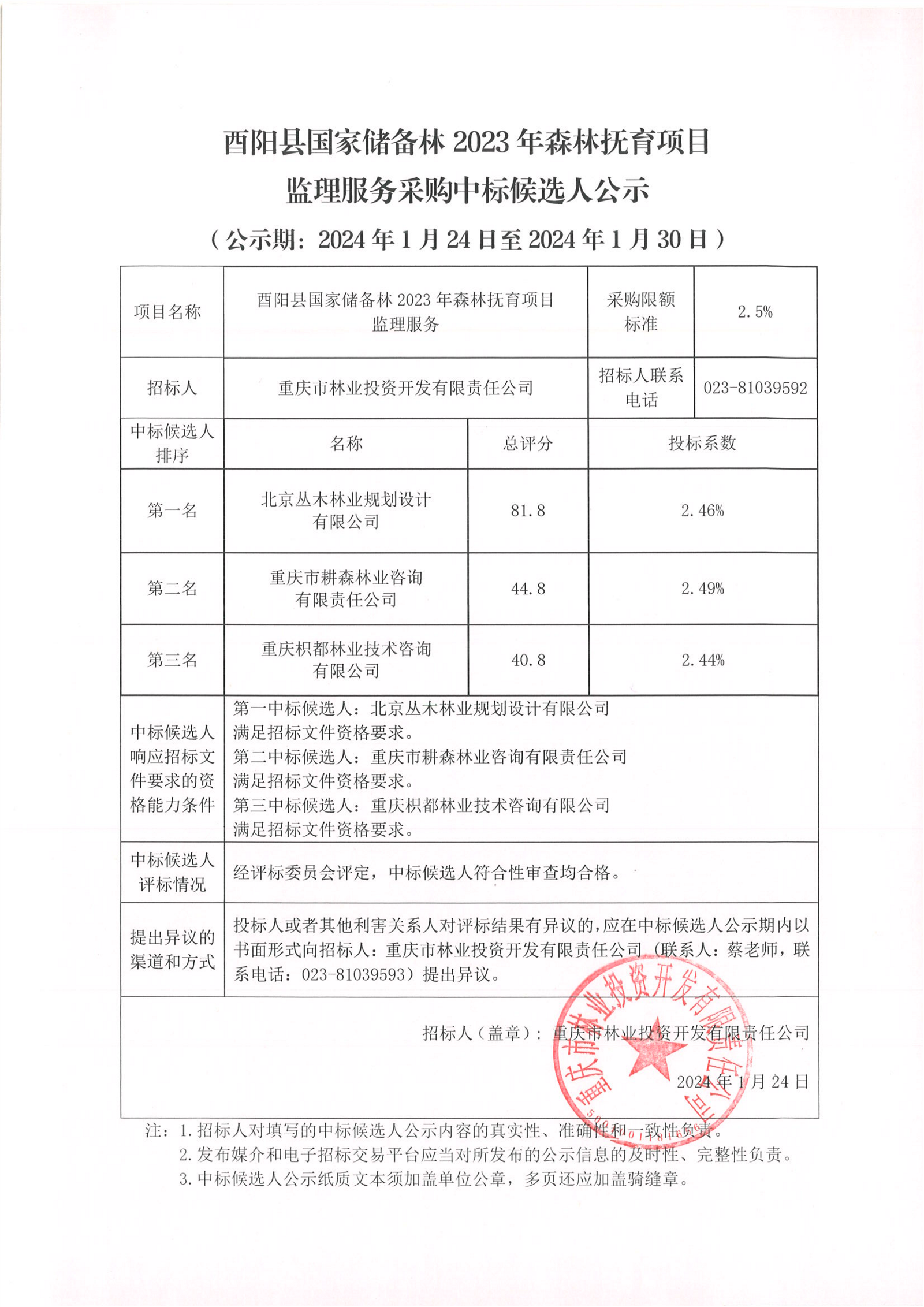 酉阳县国家储备林2023年森林抚育项目监理服务采购中标候选人公示