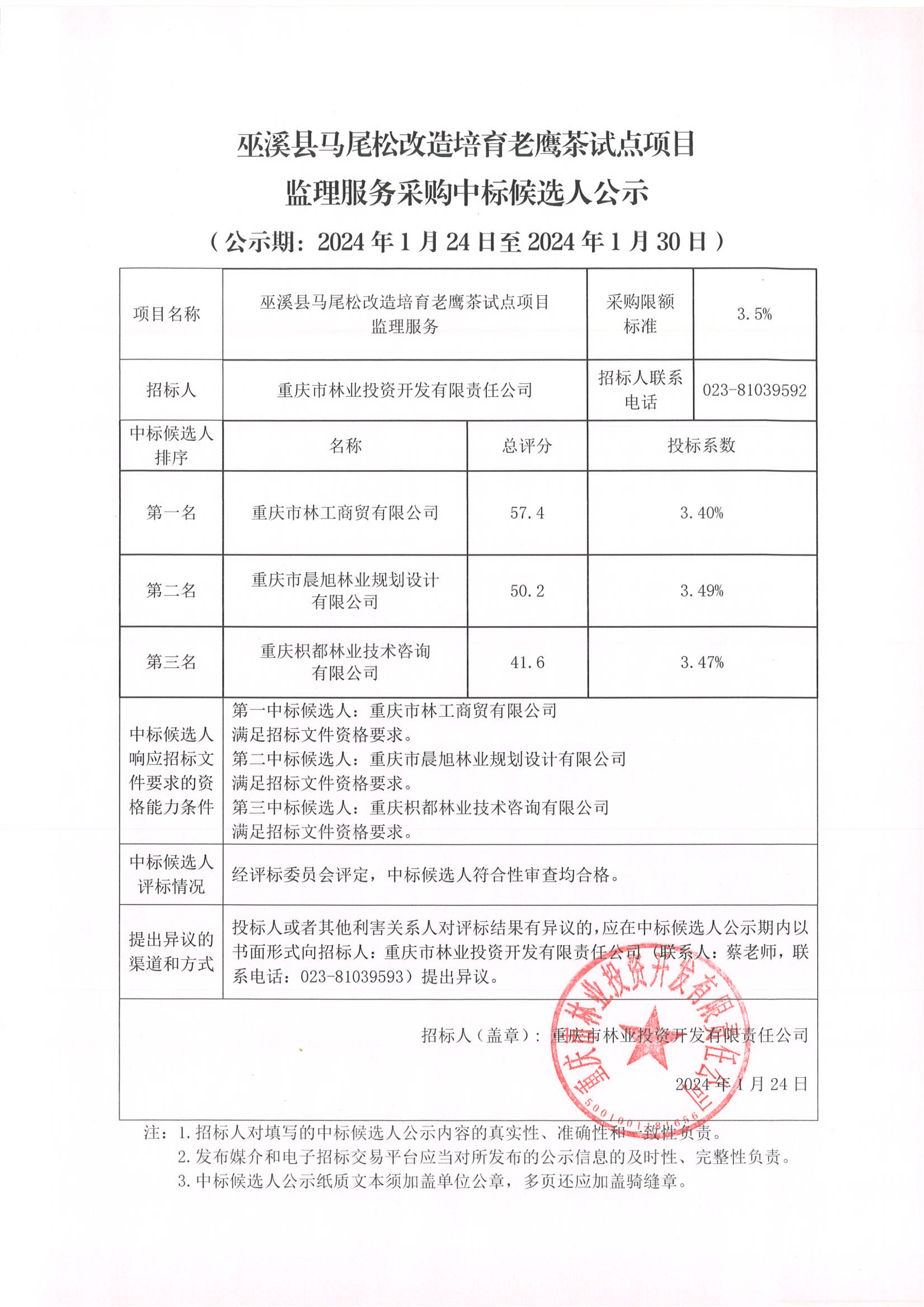巫溪县马尾松改造培育老鹰茶试点项目监理服务采购中标候选人公示