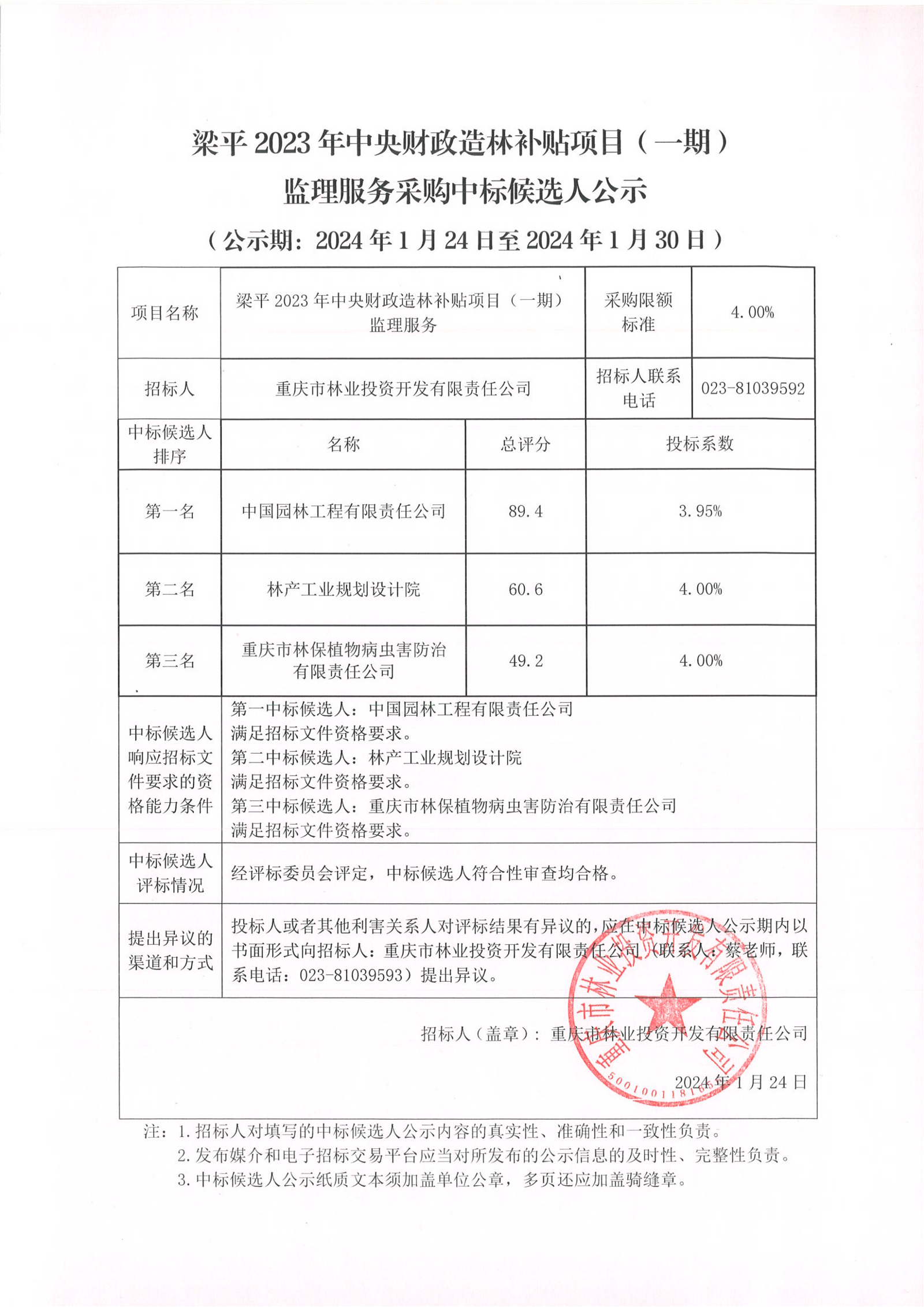 梁平2023年中央财政造林补贴项目(一期) 监理服务采购中标候选人公示