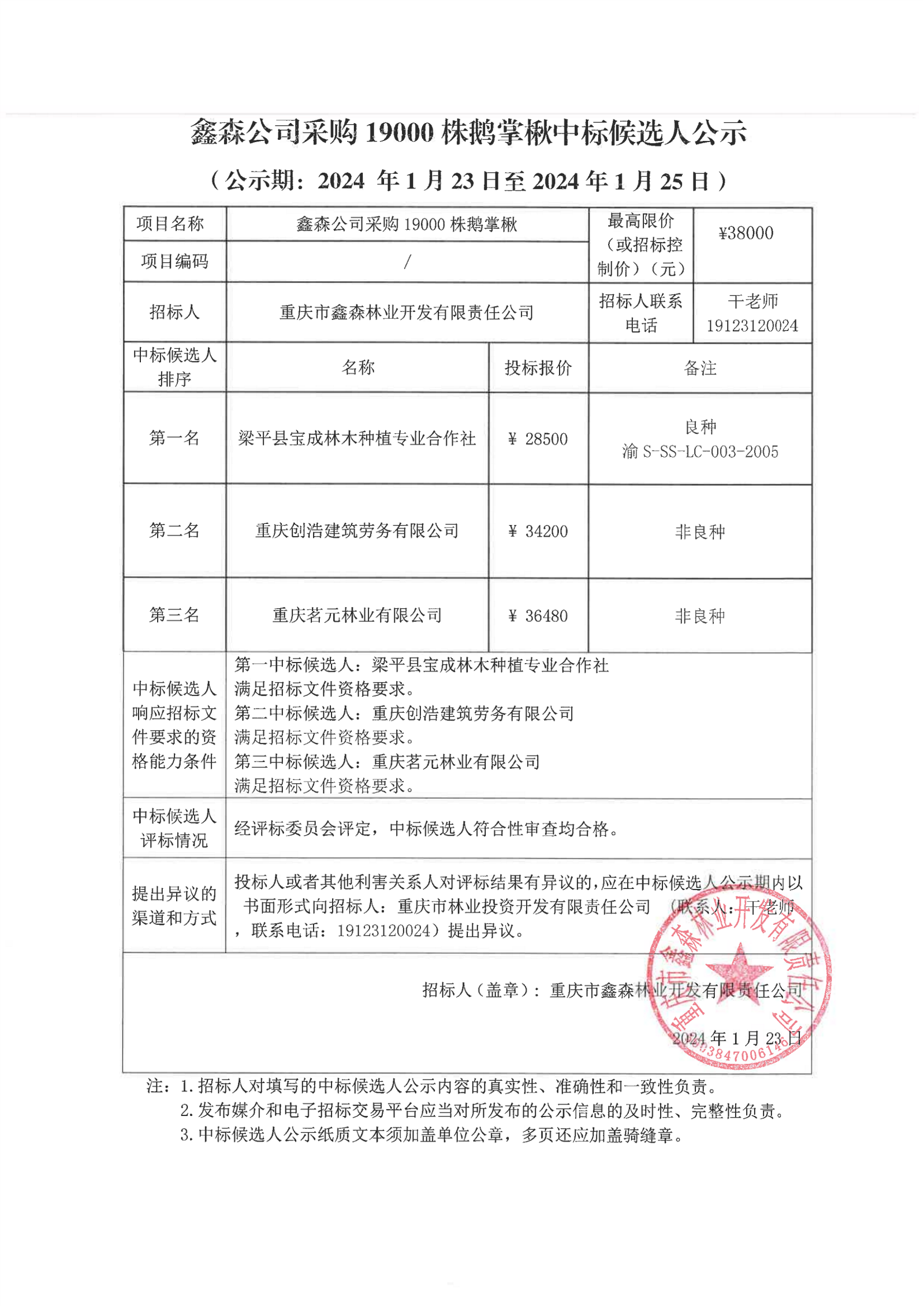 鑫森公司采购19000株鹅掌楸中标候选人公示