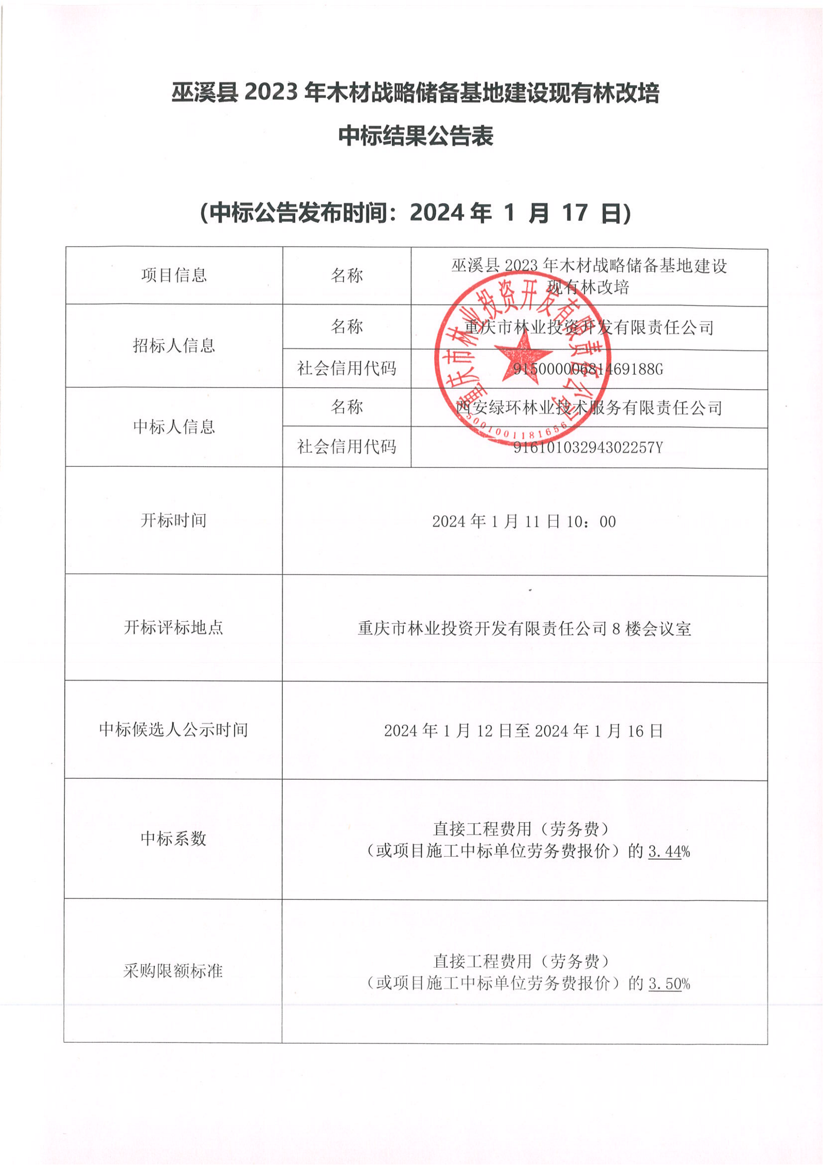 巫溪县2023年木材战略储备基地建设现有林改培中标结果公告