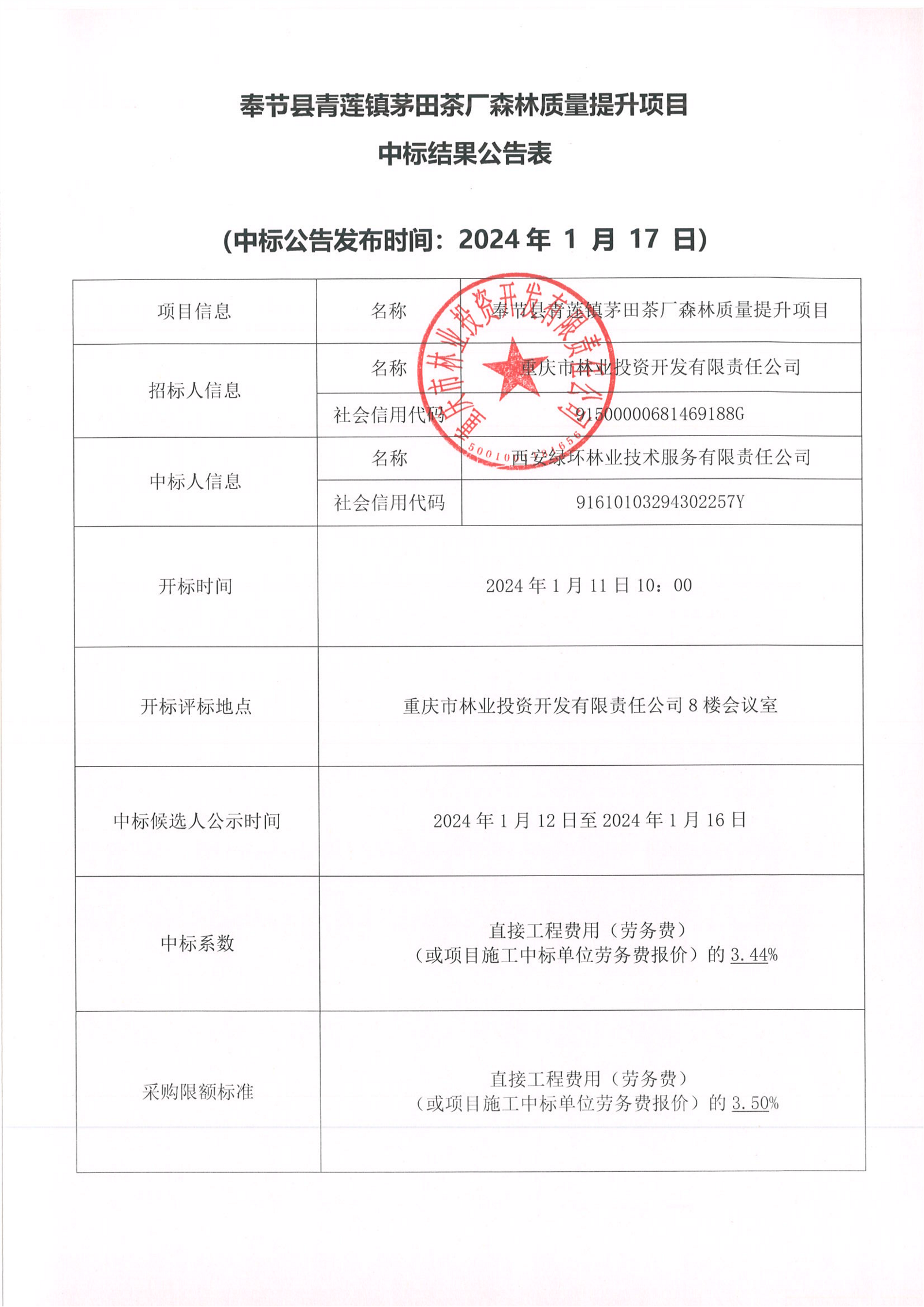 奉节县青莲镇茅田茶厂森林质量提升项目中标结果公告