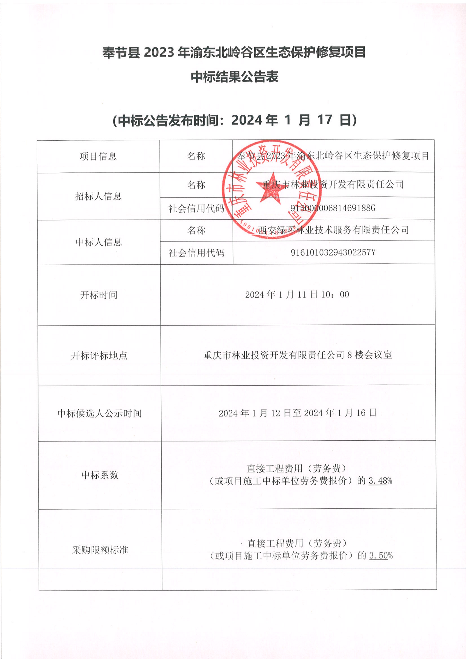 奉节县2023年渝东北岭谷区生态保护修复项目中标结果公告