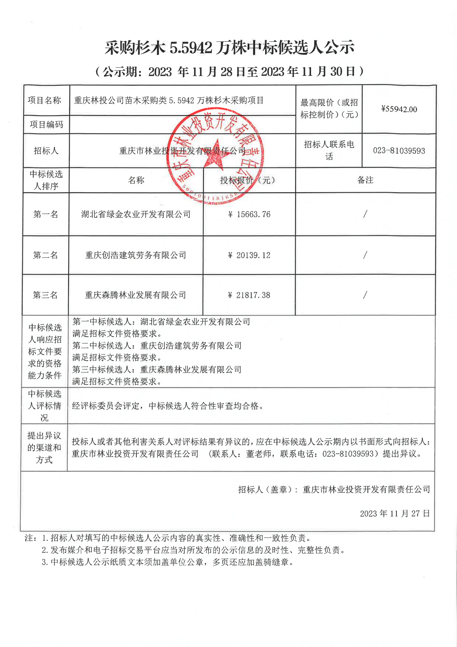 中标候选人公示:重庆林投公司苗木采购类5.5942万株杉木采购项目