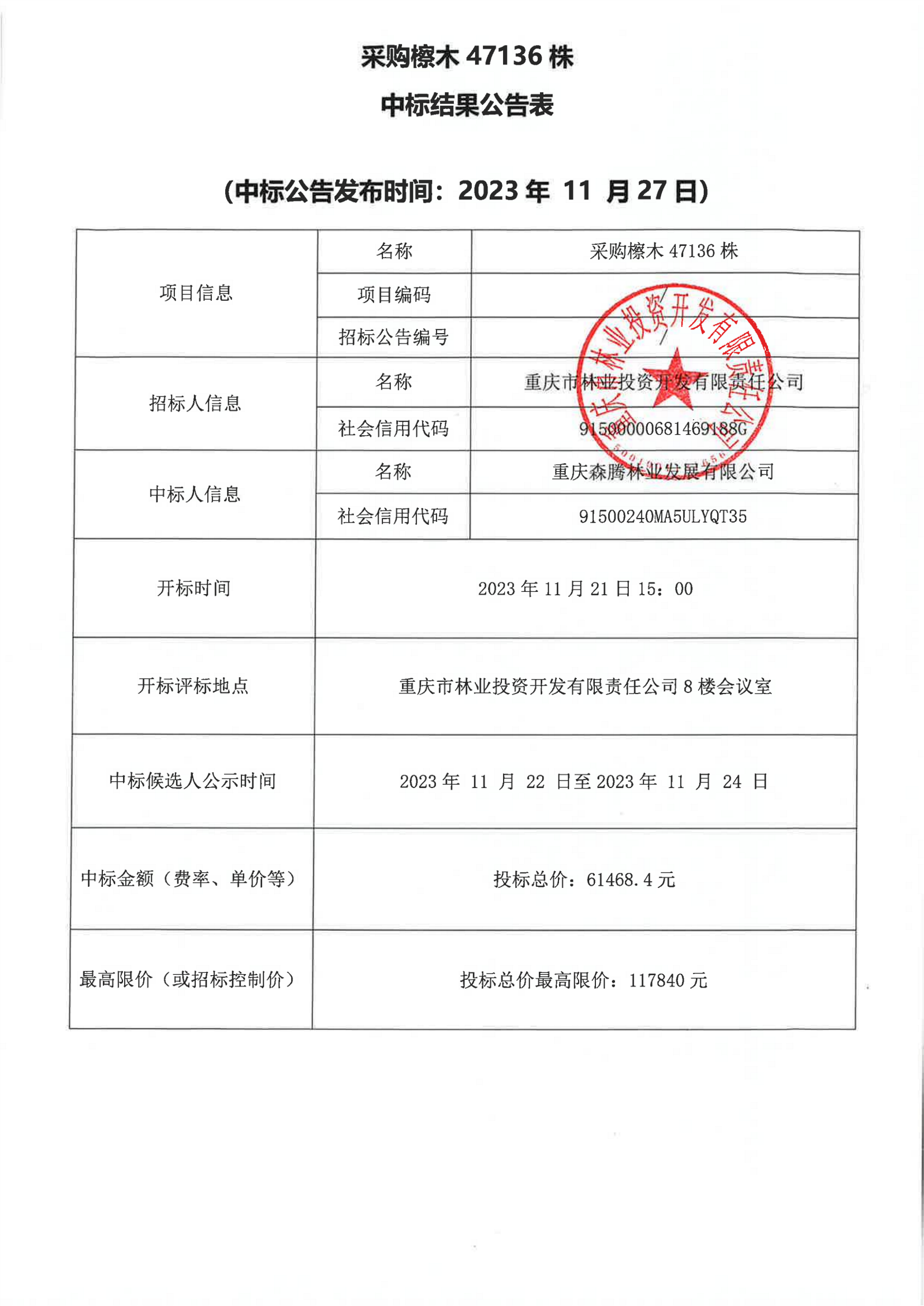 中标结果公告:重庆林投公司苗木采购类4.7136万株檫木采购项目