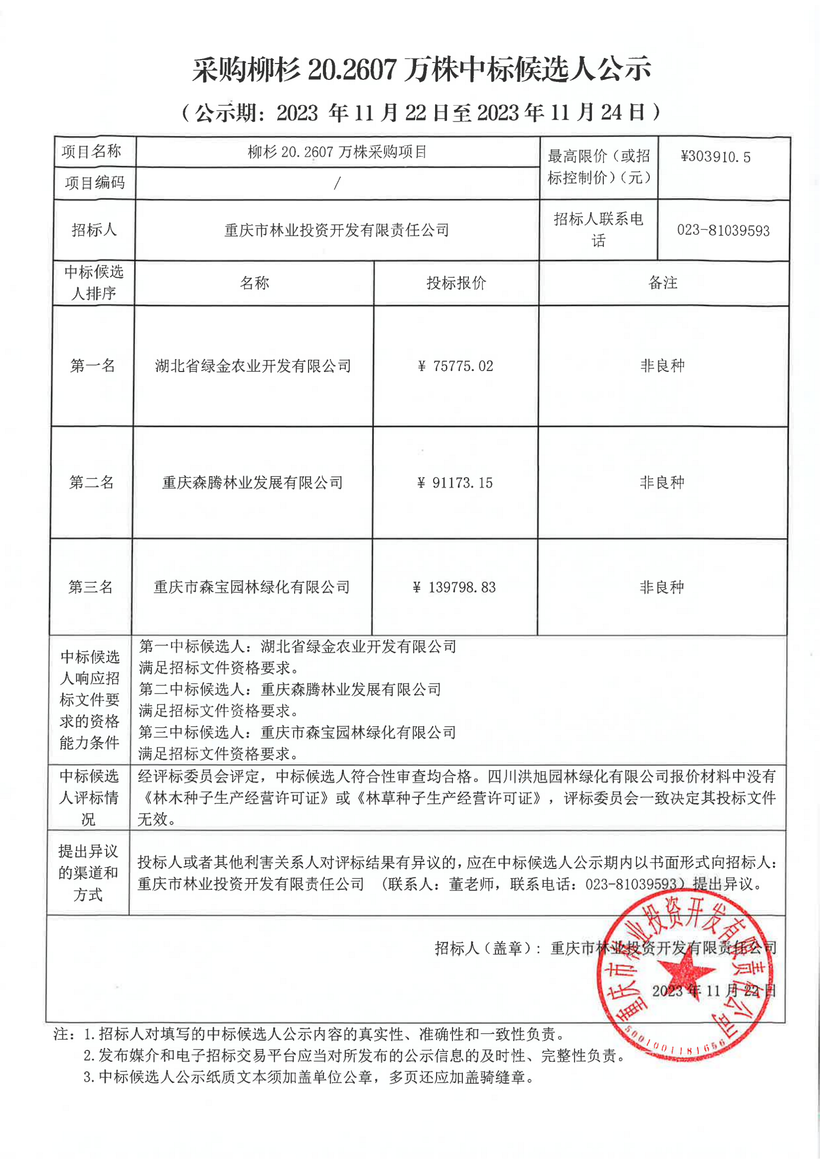 中标候选人公示:重庆林投公司苗木采购类20.2607万株柳杉采购项目