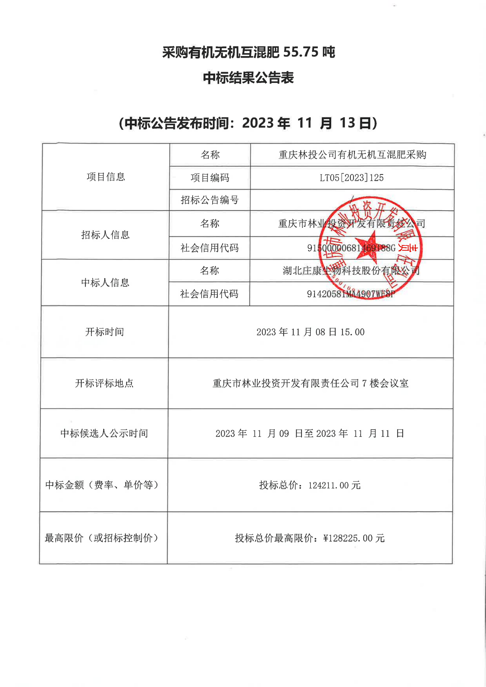 中标结果公告LT05[2023]125重庆林投公司有机无机互混肥采购