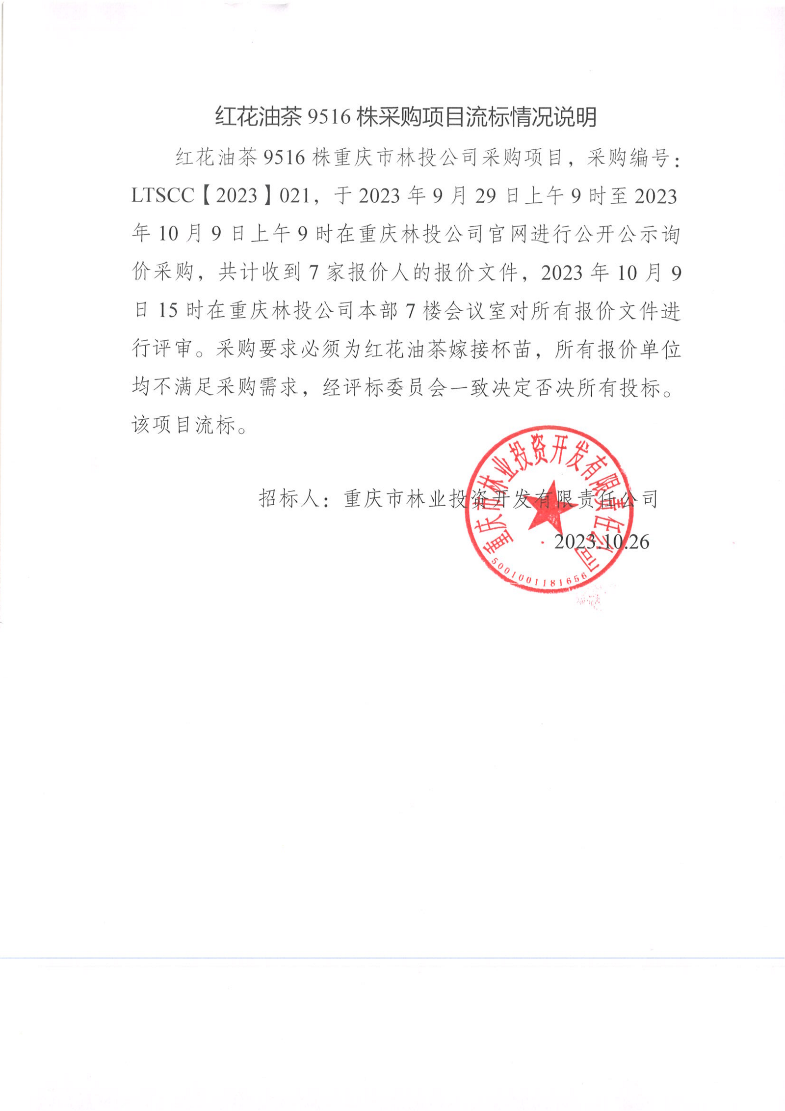 红花油茶9516株采购项目流标情况说明