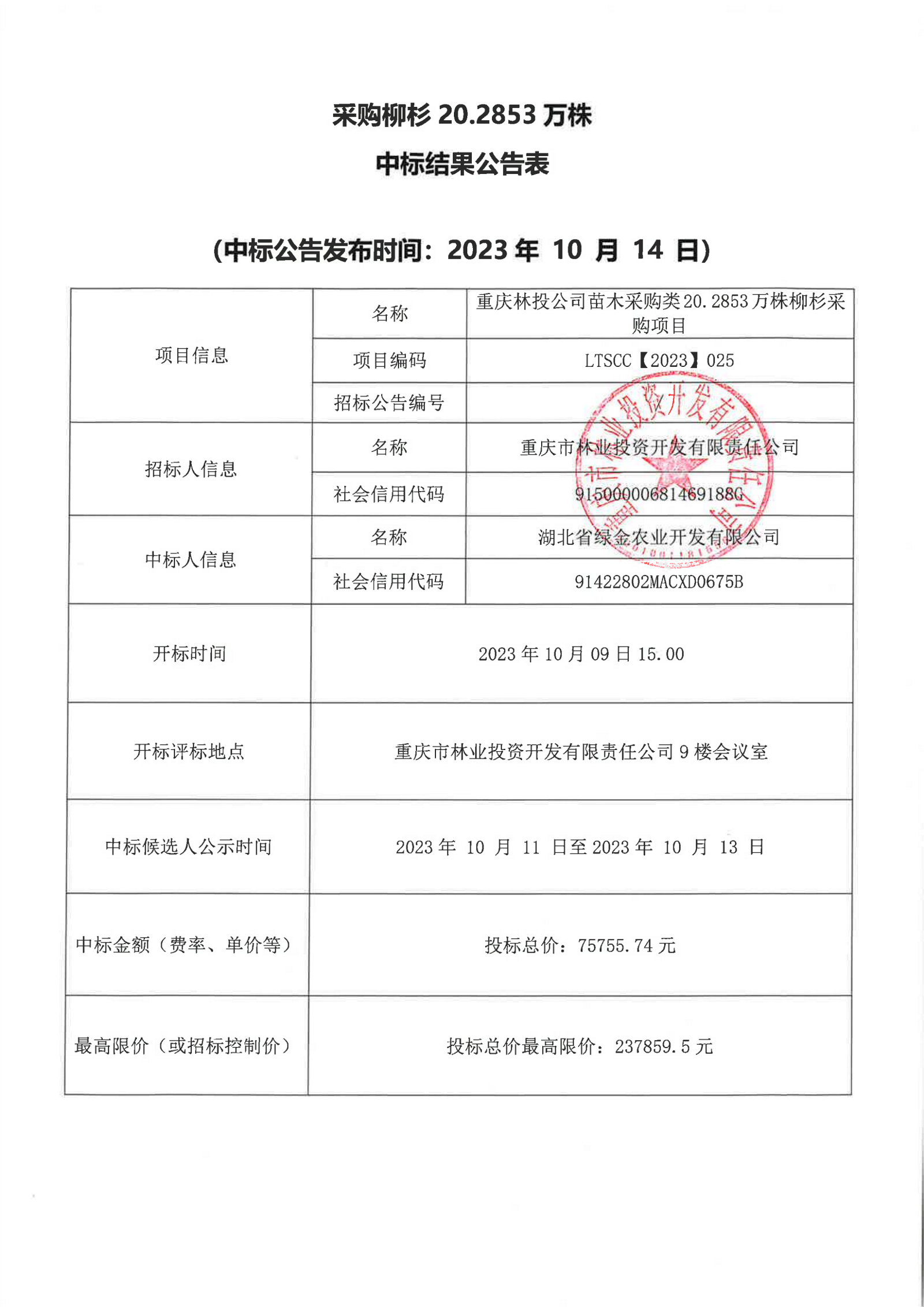 中标结果公告:重庆林投公司苗木采购类20.2853万株柳杉采购项目