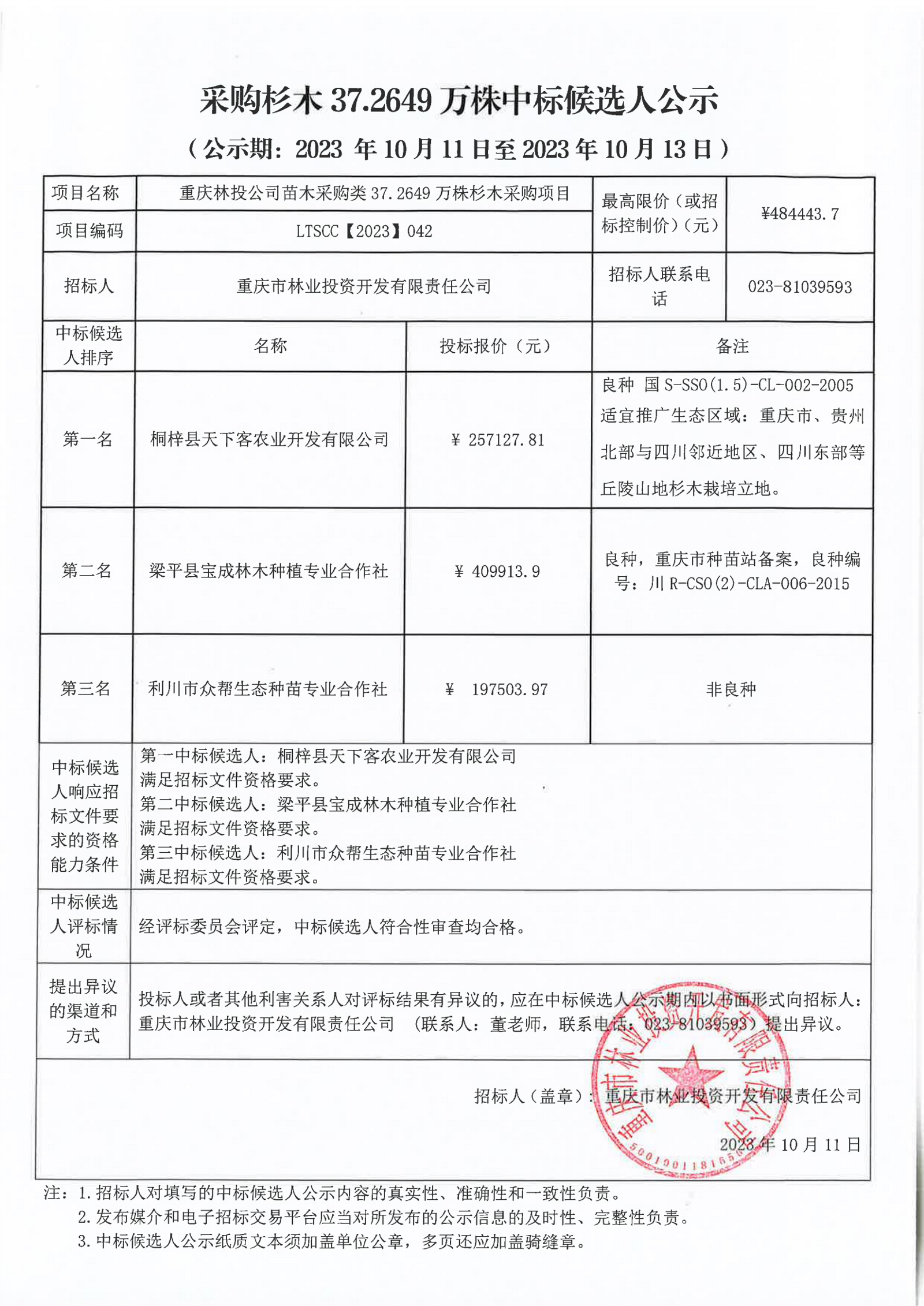 中标候选人公示:重庆林投公司苗木采购类37.2649万株杉木采购项目