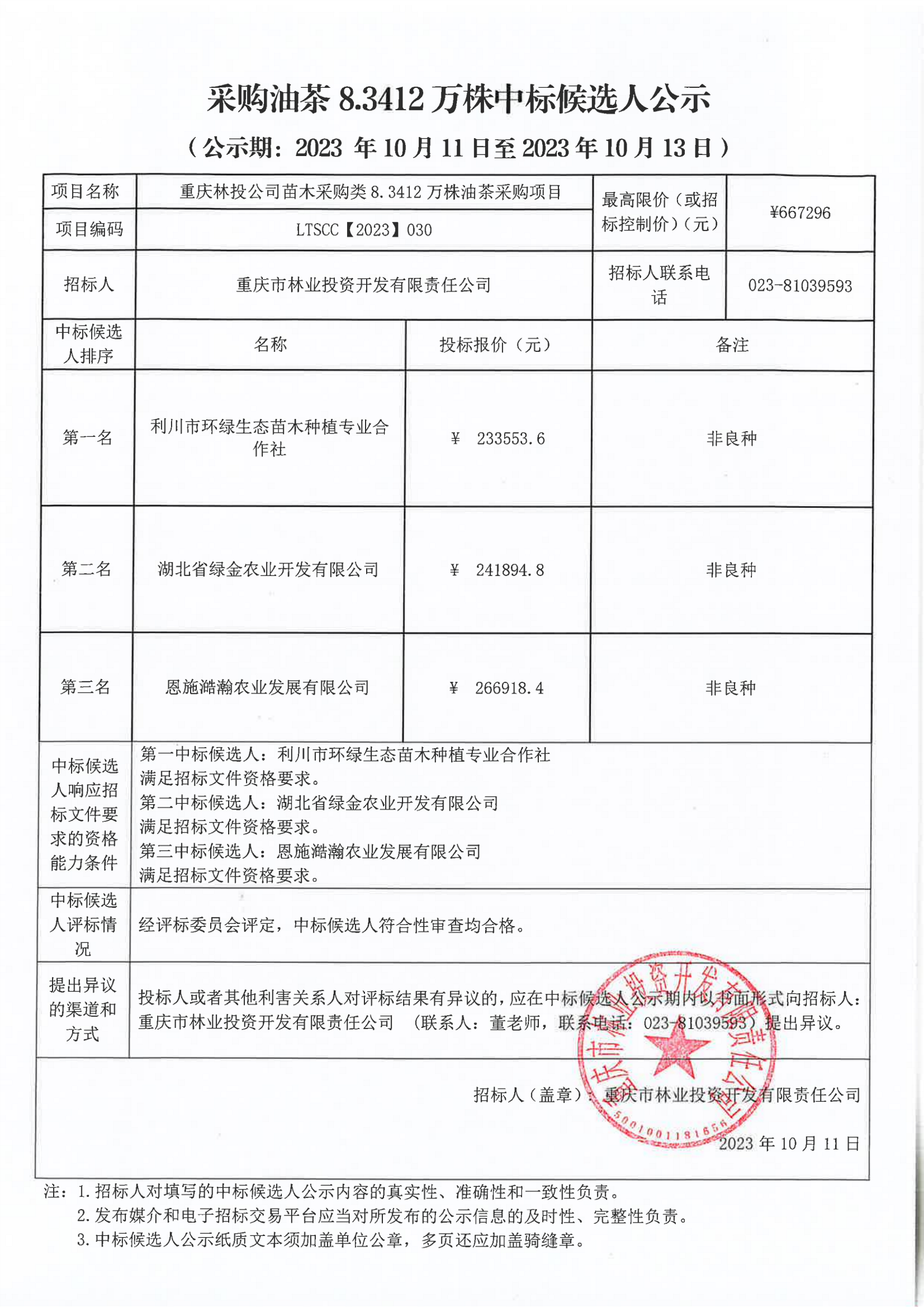 中标候选人公示:重庆林投公司苗木采购类8.3412万株油茶采购项目