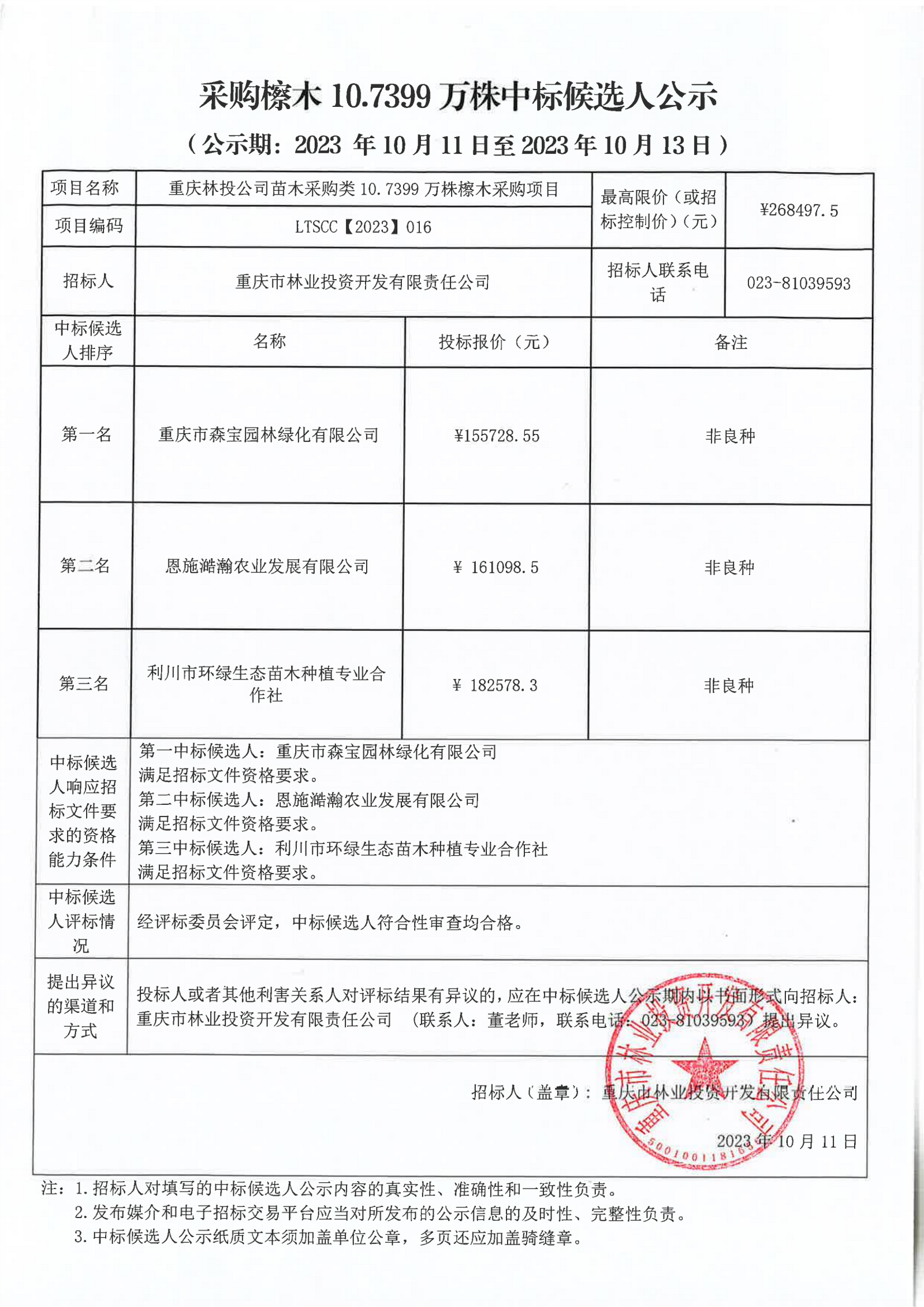 中标候选人公示:重庆林投公司苗木采购类10.7399万株檫木采购项目