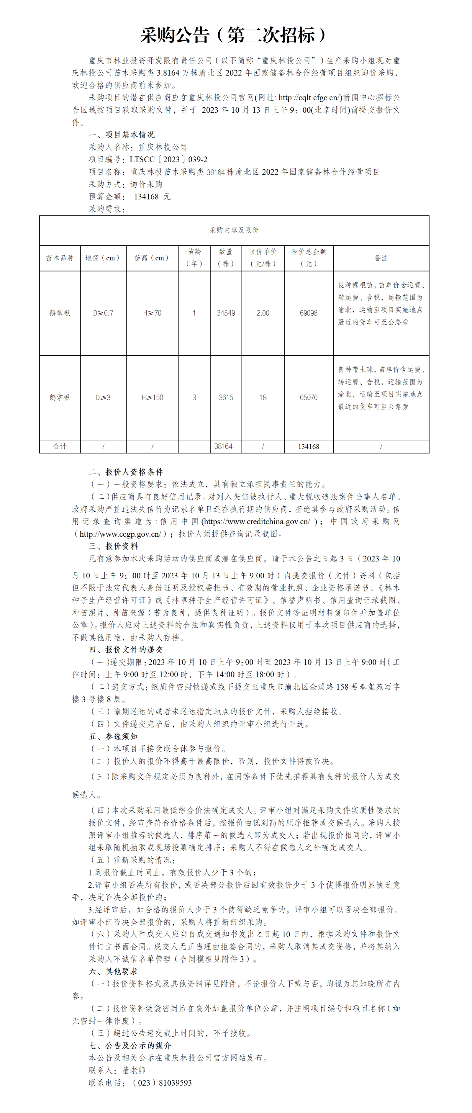 采购公告(第二次招标):鹅掌楸38164株渝北区2022年国家储备林合作经营项目