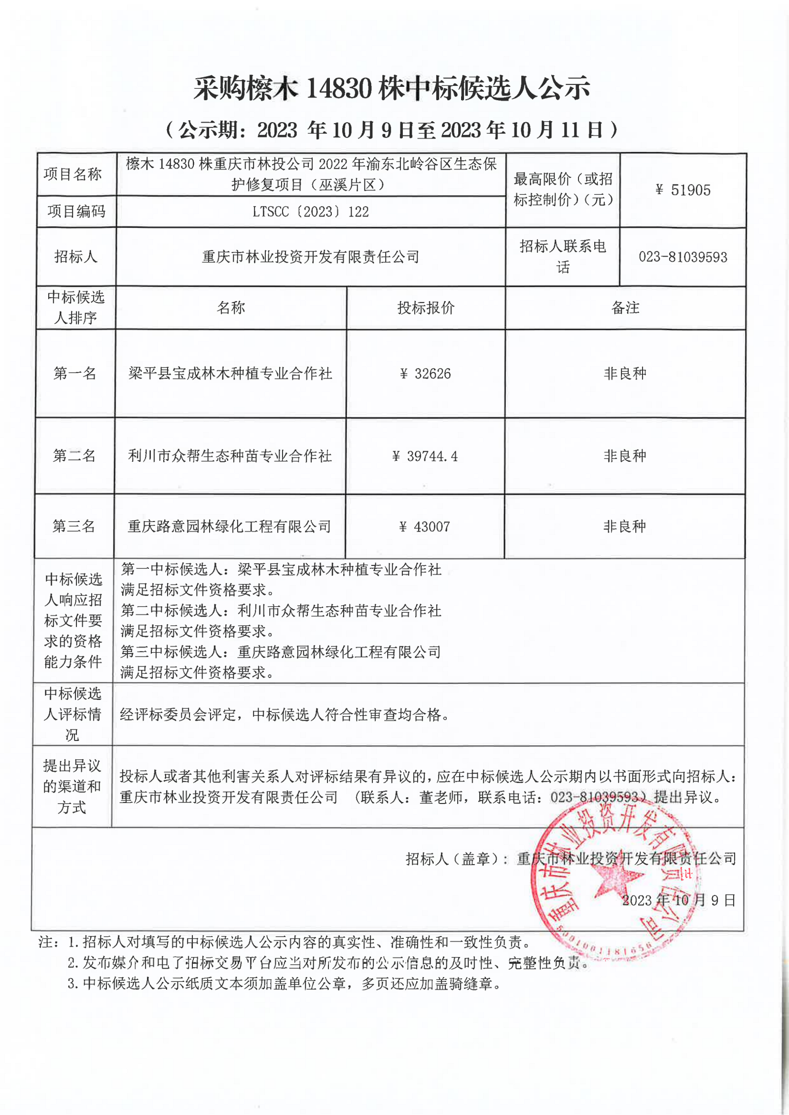 中标候选人公示:檫木14830株重庆市林投公司2023年渝东北岭谷区生态保护修复项目(巫溪片区)