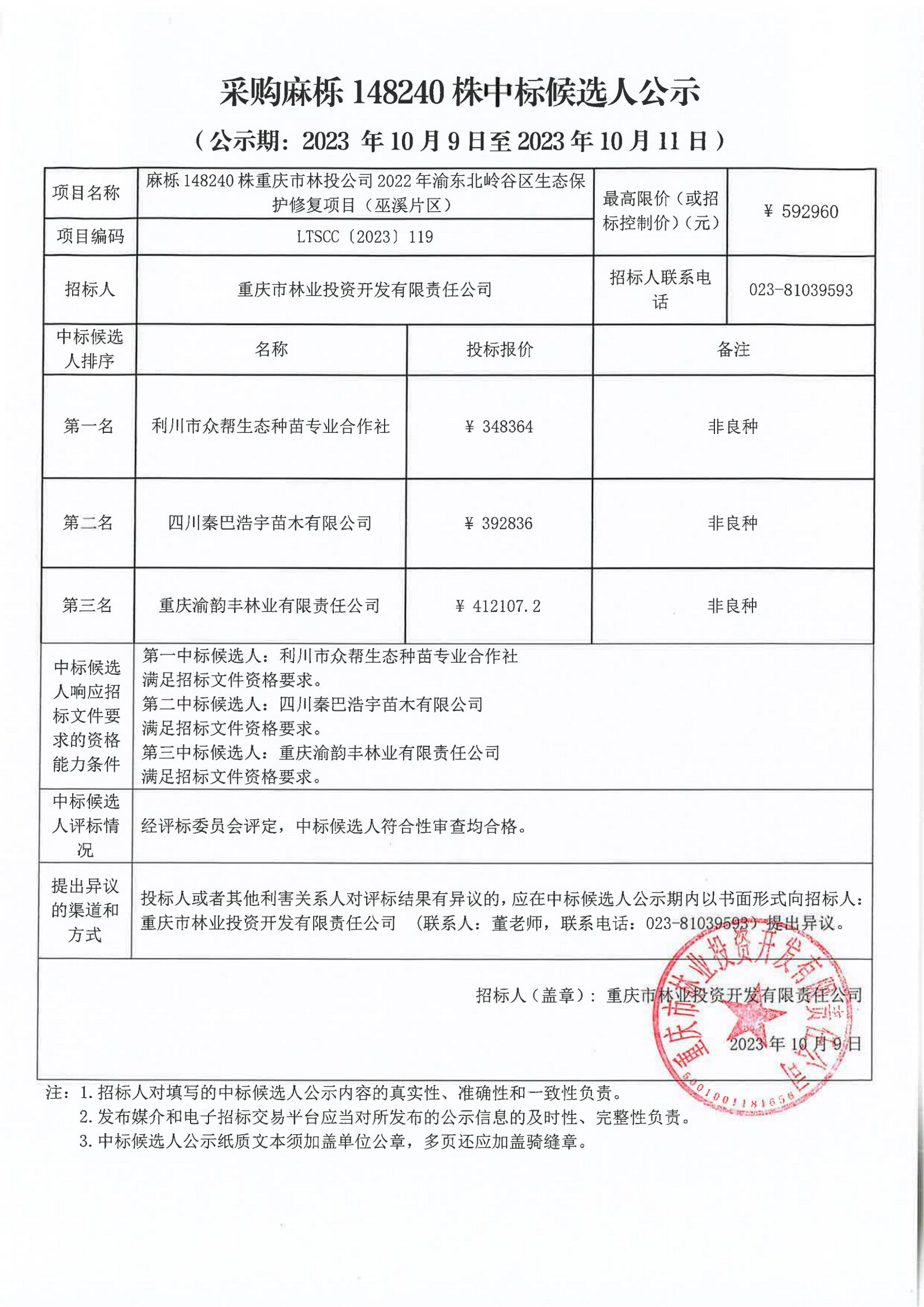 中标候选人公示:麻栎148240株重庆市林投公司2022年渝东北岭谷区生态保护修复项目(巫溪片区)