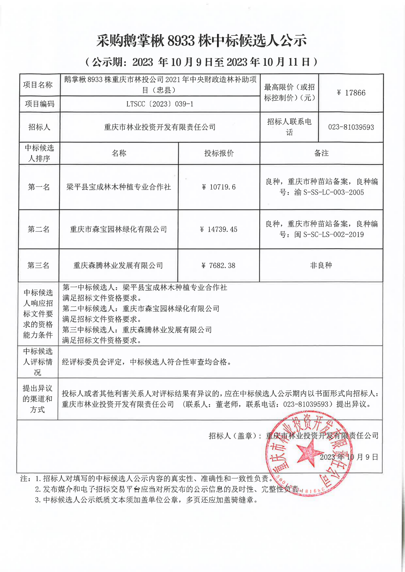 中标候选人公示:鹅掌楸8933株重庆市林投公司2021年中央财政造林补助项目(忠县)